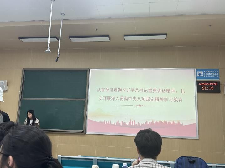 会议第二项,由王雨洁同志领学中央八项规定精神。党中央决定,自2025年全国两会后至7月在全党开展深入贯彻中央八项规定精神学习教育,这是今年党建工作的重点任务。习近平总书记高度重视,亲自谋划推动,发表系列重要讲话,多次作出重要指示,为开展学习教育指明了方向。王雨洁同志为支部党员系统讲解中央八项规定的内涵、内容以及中央八项规定精神的具体表现。支部全体成员深刻认识到中央八项规定的提出拉开了新时代全面从严治党波澜壮阔的历史进程,纷纷明确将自觉遵守中央八项规定精神内化为心中坚定的信仰,外化为日常的行为准则,为教育强国建设贡献华师力量。