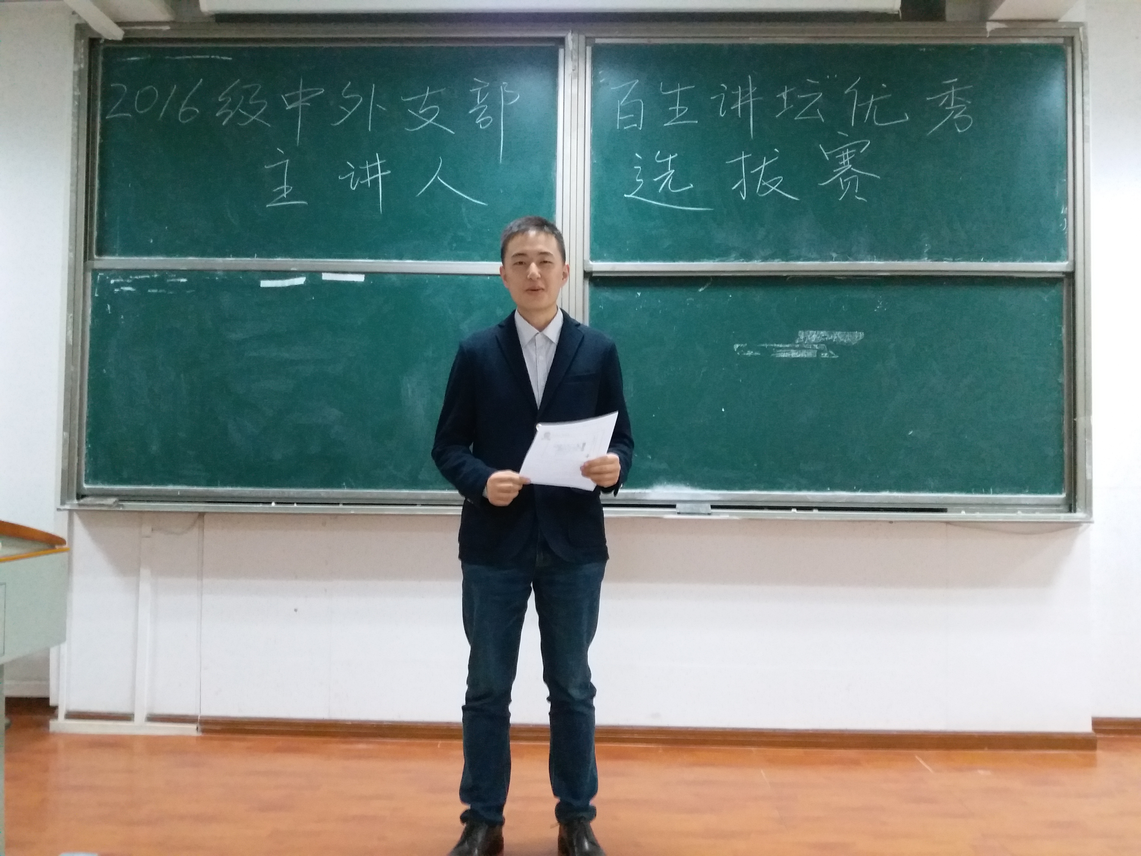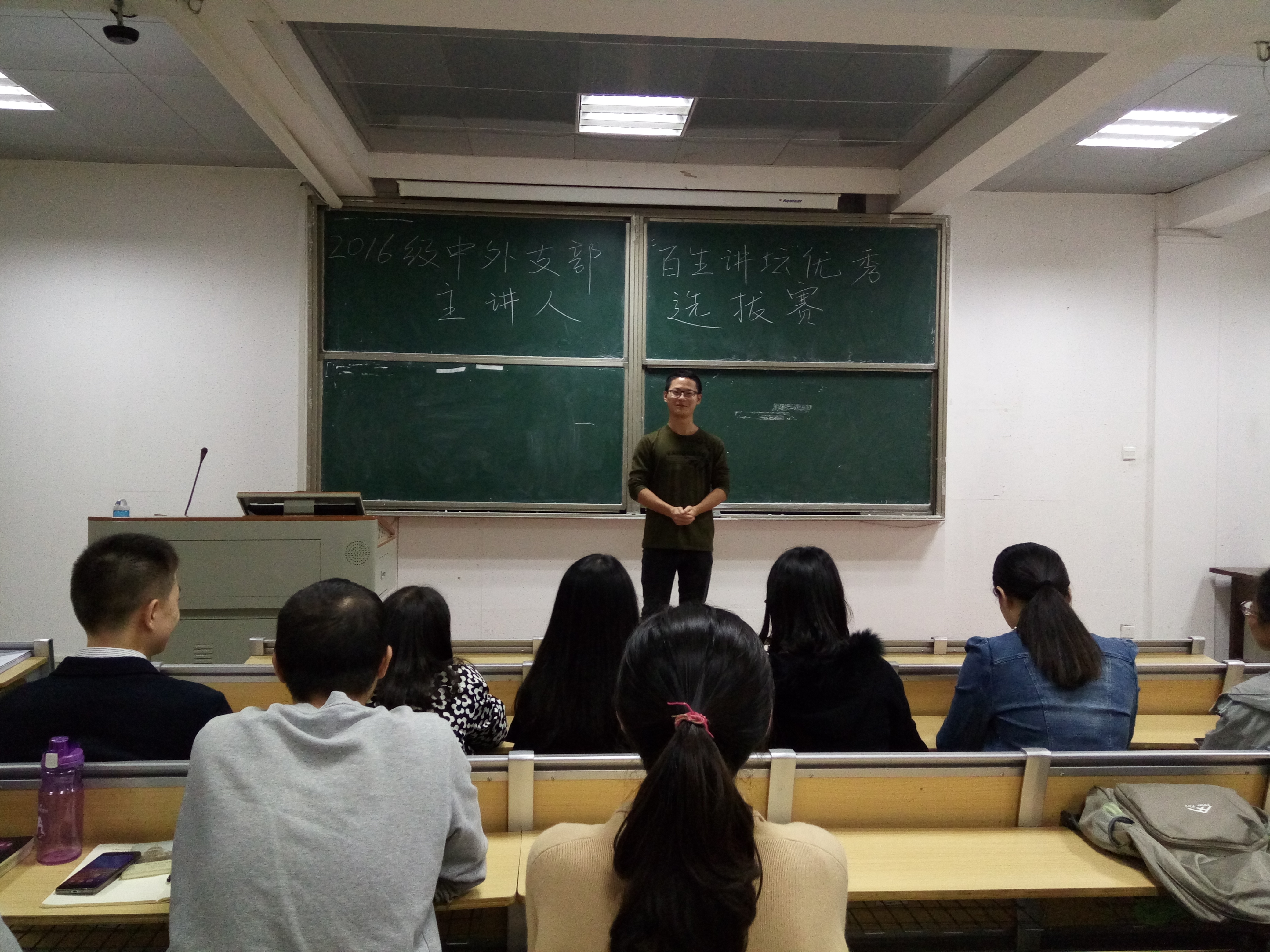 比赛开始前,赵守超同学介绍了“百生讲坛”的具体相关内容。他指出,为将学习宣传贯彻习近平总书记系列重要讲话精神持续引向深入,校团委决定于2016年在全校共青团组织中学习宣传贯彻习近平总书记系列重要讲话精神“四进四信”活动,以“四进”为手段,以“四信”为目标,持续深入开展校、院二级“百生讲坛”活动,为响应此次活动的号召,需要选举出一名同学代表16级中外支部参加院级“百生讲坛”优秀主讲人的评选比赛。此后,赵守超同学宣布比赛正式开始。