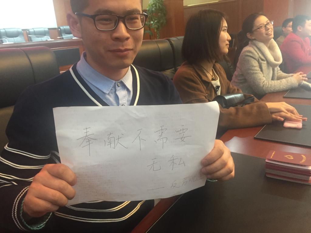 2016年3月14日下午,华中师范大学政治学研究院15级社工支部在模拟联合国举行“学本禹. 讲奉献”辩论会。这次辩论会的主题是“奉献与无私”,全班同学分为正方两方,正方论点是“奉献需要无私”,反方论点是“奉献不需要无私”。本次辩论会的主要目的是:通过辩论让同学们更加深刻的理解和领悟《有一种青春叫做奉献--本禹和本禹们的爱心接力》一书中主人翁徐本禹的志愿精神。本次活动由支部书记常畅主持,社工支部全体同学参加了活动。