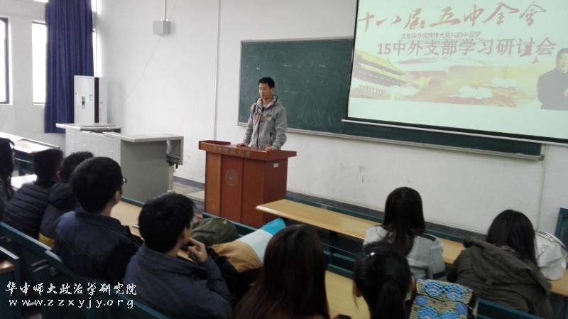 2015年11月13日上午11时,15中外支部在8号教学楼508室成功举办学习中国共产党十八届五中全会精神研讨会。活动由支部书记刘孝杰主持,支部全体同学共24人全部出席。