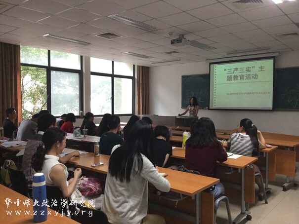 2015年6月5日,2014级科学社会主义与国际共产主义运动专业全体同学在本院313教室召开了“三严三实”主题学习活动。首先支部书记程蕊为大家传达了习近平总书记关于推进作风建设的的“三严三实”的讲话精神的具体内容,三严就是严以修身、严以用权、严以律己,三实就是谋事要实、创业要实、做人要实。支部书记提出,我们要深入贯彻党的重要讲话精神,关键在于在平时的学习、工作和生活中落实到行动之中,所有党员和学生干部都要对自己有着严格的要求,严明政治纪律,严守政治规矩,做到在其位,谋其政,为同学们做实事,要树立先锋模范作用,形成风清气正的支部氛围。