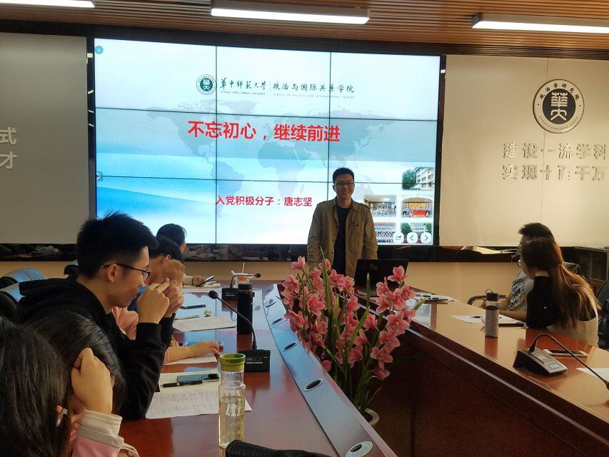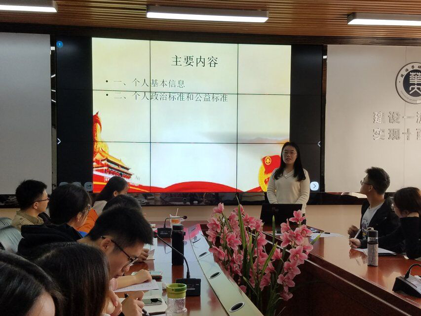 随后,两位符合党员发展条件的入党积极分子秦晓、唐志坚依次以PPT的形式进行个人陈述。秦晓同志从对党的认识、思想觉悟、参与公益活动的情况以及在组织中的表现等方面表达了自己的入党决心。唐志坚同志向大家讲述了自身从入党积极分子向预备党员跨越的心路历程,表明自己将“不忘初心,继续前进”,向党组织不断靠拢。