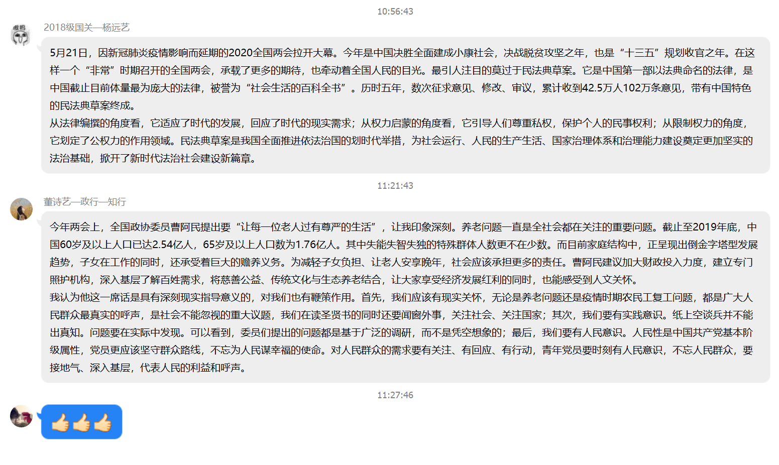 政治与国际关系学院政治所研究生第一党支部丁亮:2020年5月21日下午三点,中国两会时间正式拉开帷幕。从两会的内容安排上,我能够深切感受到:1、人民至上,生命至上。在两会召开前增加了两会默哀,能够感受到代表和委员们肃立中的温度和力量。一分钟的默哀,有沉痛,有温度,饱含着一个民族坚持生命至上,战胜一切灾难的信心和决心。2、凝心聚力,砥砺奋进。困难面前,个体的力量总是有限的,两会发出了强烈的信号,各族人民团结奋进,凝心聚力搞建设。3、东西南北中,党政军民学,党是领导一切的。党的领导是我国制度的特色和优势,是开启“中国之治”和构建“中国方案“的牵引力。两会持续迸发出的活力、人民为本的深刻现实印证了这一点。