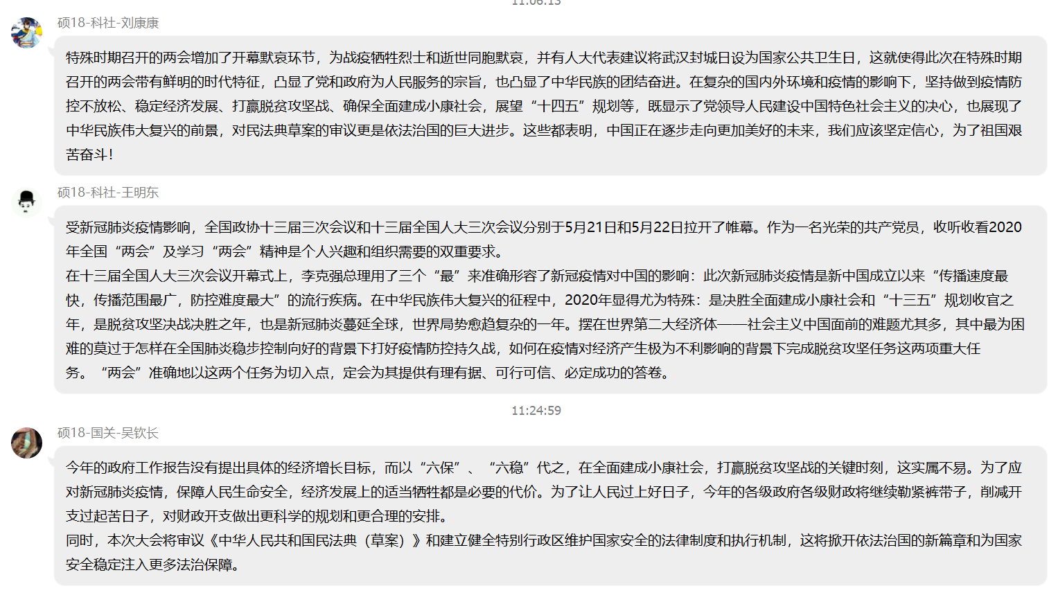 收看相关直播报道后,各支部依托网络,通过开展“云党日活动”、“云班会”等形式积极学习、讨论、领悟会议精神。同学们围绕政府工作报告及全国政协常委会工作报告展开讨论,相互交流,进一步强化学习效果,加深了对“两会”精神的理解与认识。