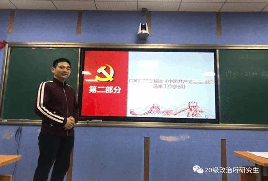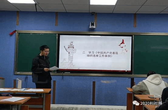 为贯彻落实新时代党的建设总要求和新时代党的组织路线,坚持和加强党的全面领导,坚持党要管党、全面从严治党。2020年11月19日中午,政治与国际关系学院科社所第三党支部在学院304教室开展学习《中国共产党基层组织选举工作条例》(以下简称《条例》)以及开展党支部和党员诊断行动的主题党日活动。本次活动由支部组织委员张复港同志主持,党小组组长徐睿烨同志作学习分享,全体党员和入党积极分子参加。