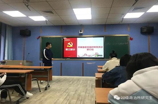 活动进入第三项开展党支部和党员诊断行动,徐睿烨同志借用科社所第二党支部的问题报告,学习第二党支部的先进经验,针对性提出了第三党支部在建设过程中应该注意的地方,随后由支部积极分子伊晨晨作自我诊断,伊晨晨同志对照党章与新《条例》批评自己加入支部以来做的不到位的地方,表示在以后支部的建设中努力发光发热。最后支部书记彭稳稳同志做了简要的活动总结,她指出,虽然我们支部成立时间较短,在支部建设中经验不足,但在接下来的工作中要主抓支部建设的“硬核”能力,相信通过各位党员干部的努力,科社所第三党支部的发展一定是芝开花节节高!