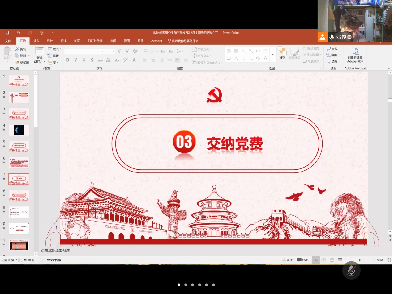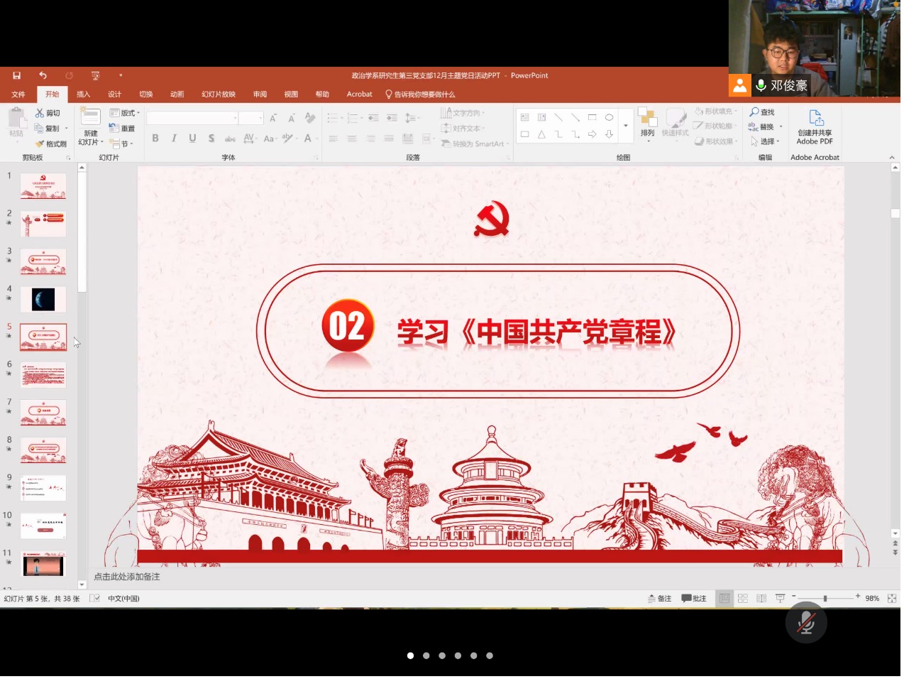 2022年1月4日晚,政治学系研究生第三党支部于线上开展12月支部主题党日活动。本次活动的议程为:一、观看视频:《2021年度声音盘点》;二、学习《中国共产党章程》;三、交纳党费;四、学习中央政治局党史学习教育专题民主生活会会议精神和习近平总书记重要讲话精神;五、学习领会党史学习教育总结大会精神;六、支部书记总结。本次活动由支部书记邓俊豪同志主持,政治学系研究生第三党支部全体党员、团员参会。
