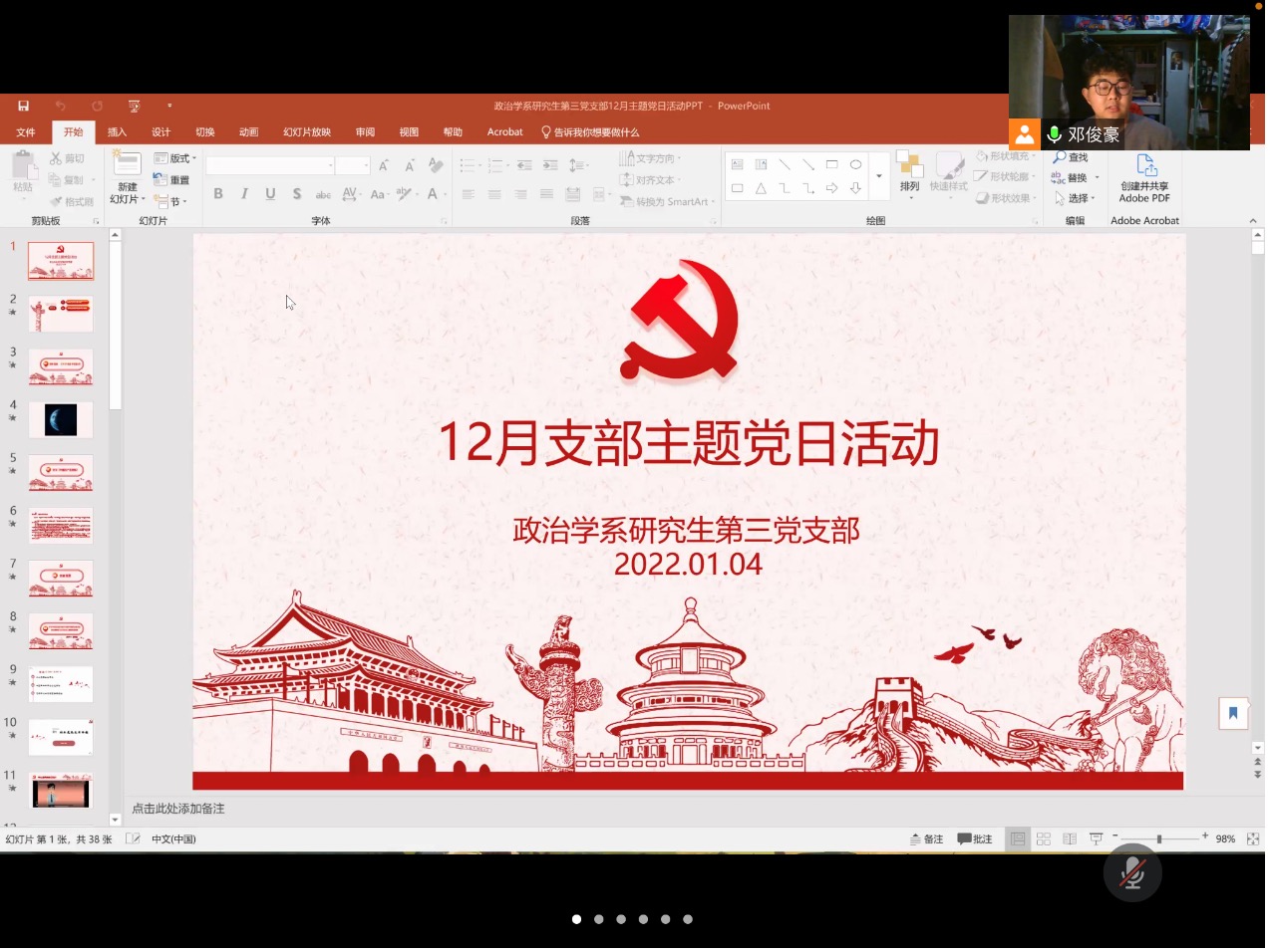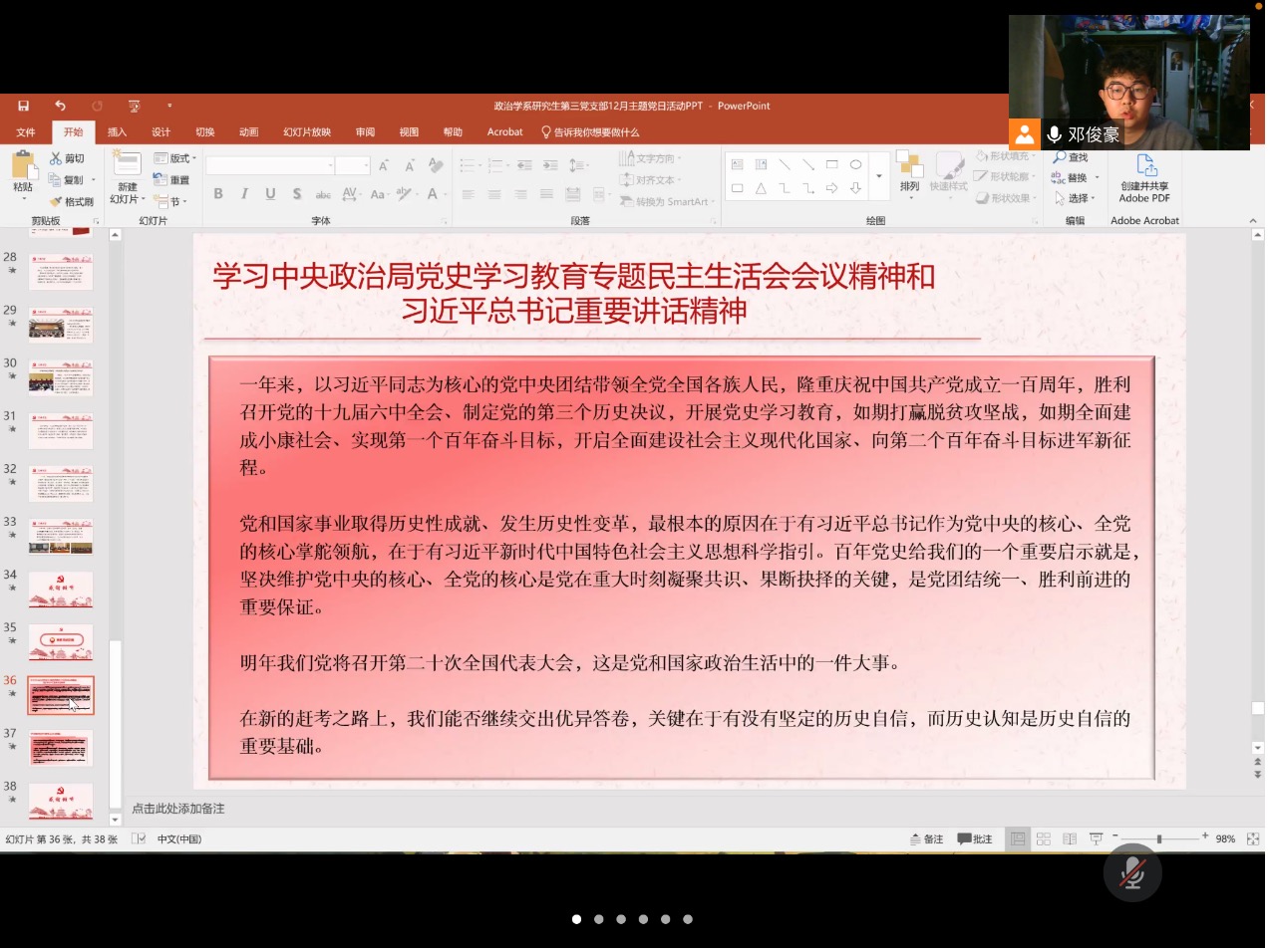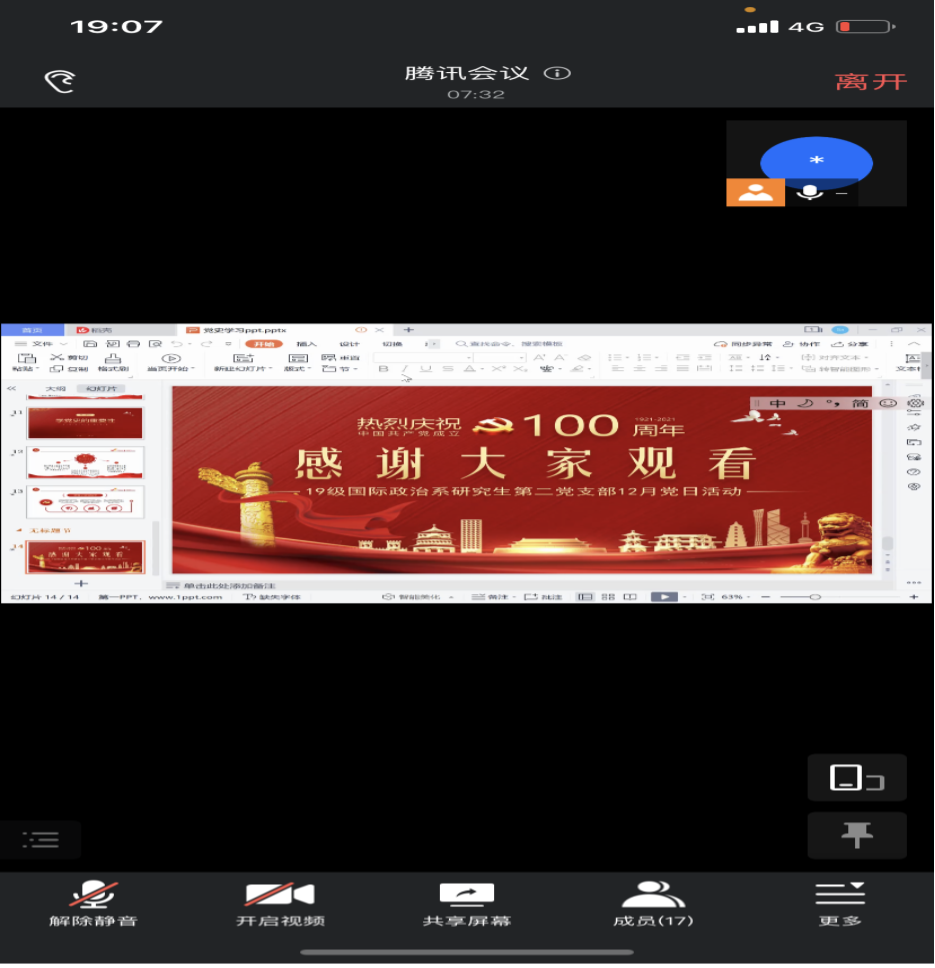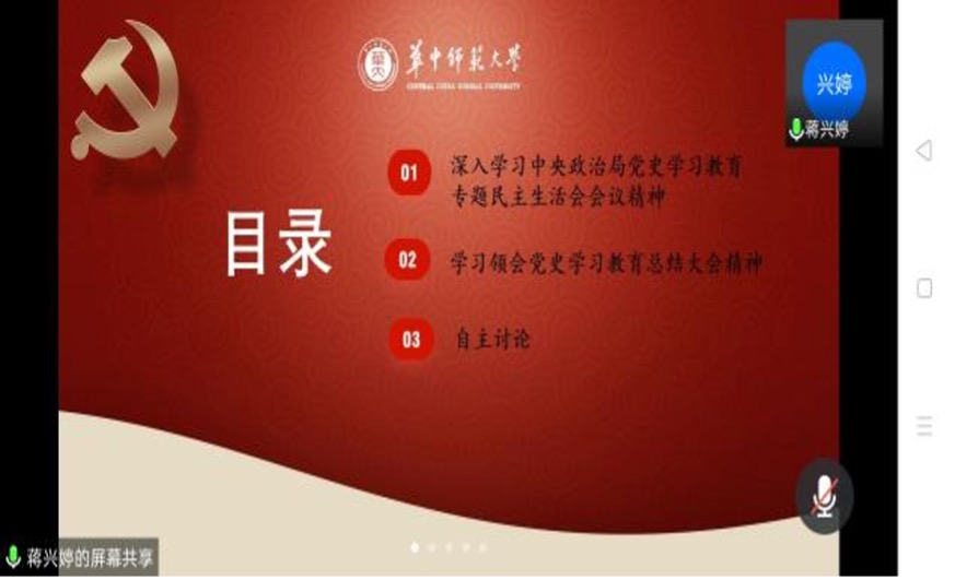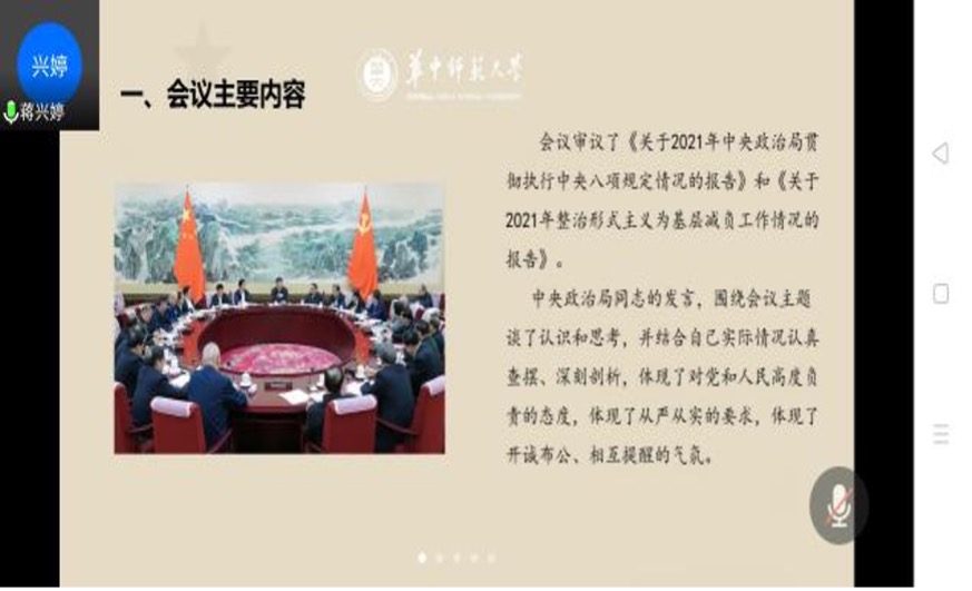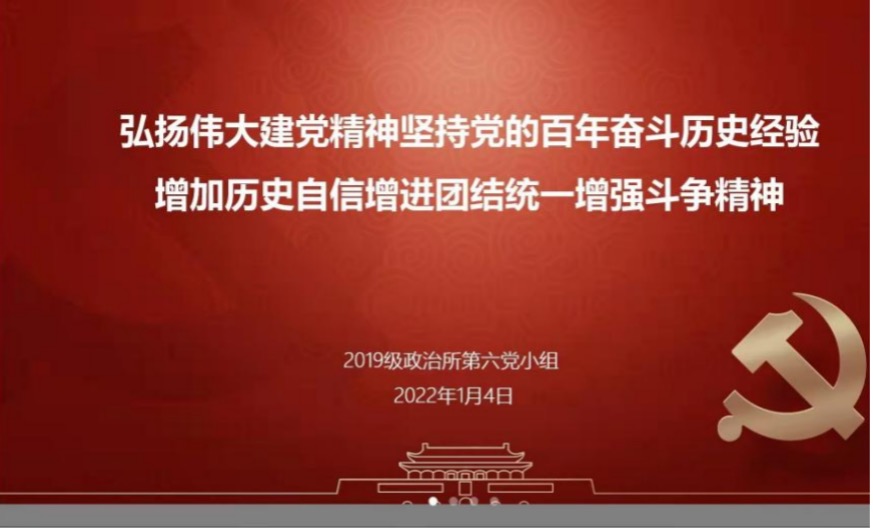 2022年1月4日,华中师范大学政治与国际关系学院科社所第三党支部召开以“学中共党史、增奋斗精神”的线上党日活动,本次活动由支部组织委员张复港主持,支部书记彭稳稳主讲,支部党员、预备党员、发展对象及积极分子参与。