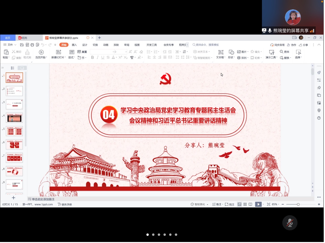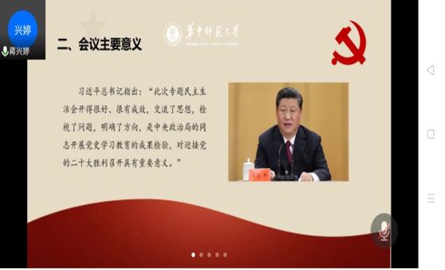 活动进入第四项,由熊琬莹同志带领大家学习中央政治局党史学习教育专题民主生活会会议精神和习近平总书记重要讲话精神。熊琬莹同志从“什么是民主生活会”、“专题民主生活会会议精神”、“习近平总书记重要讲话精神”三个方面进行了分享。在分享中,她结合视频、图表、思维导图等方式进行讲解,内容充实、梳理细致,并结合个人经历、以及本专业特征进行解析,从过去、现在和未来三个维度强调了我们学习党史的必要性,倡导大家将党史学习教育结合自身发展,落到实处,保持学习党史的持续性。熊琬莹同志的分享详细且深刻,其对于党史学习教育专题民主生活会会议精神和习近平总书记重要讲话精神的理解之透彻令与会成员纷纷赞叹,支部书记邓俊豪同志也表示,我们都应当向熊琬莹同志学习。