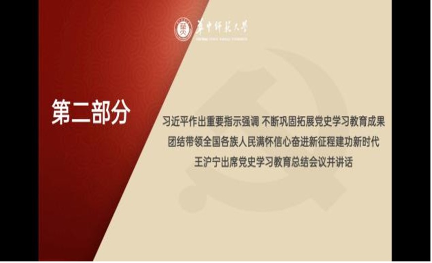 在第二部分内容学习中,主要对习近平总书记在党史学习教育总结大会作出的重要指示内容以及王沪宁同志出席大会的讲话内容进行了学习和领会。