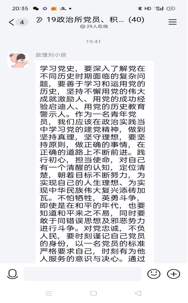 会议结束后,各位党员同志也以文字形式在群内分享了自己的学习感悟。