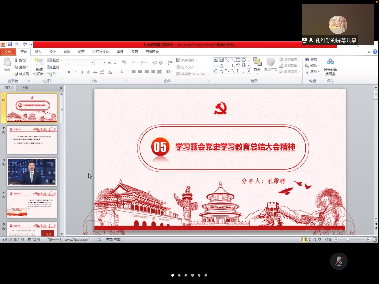 活动进入第五项,由孔维舒同志带领大家学习领会党史学习教育总结大会精神。孔维舒同志首先向大家介绍了党史学习教育总结大会的主要内容,继而借用央视新闻报道片段,让大家更为清晰地了解本次总结大会的详细内容。接着,孔维舒同志摘取总结大会中习近平总书记以及王沪宁同志的部分重要讲话,帮助与会同志更准确地领会党史学习教育总结大会精神。孔维舒同志强调道,各级党组织一年来着力推动党史学习教育扎实深入开展,我们新时代的青年党员,同样感受到了党史学习教育活动开展的丰硕成果,接下来我们仍然不能放松对于党史的学习,应当继续深入领会,将党史学习教育贯彻落实到每个人的学习和生活中去。