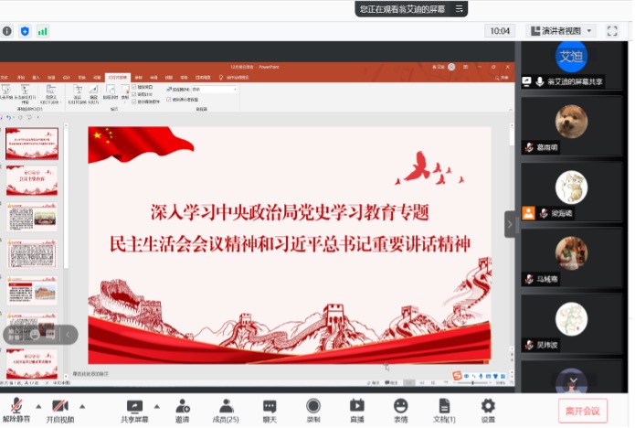 会议伊始,蒋兴婷同志首先介绍了本次的学习内容。其中包含两个方面的内容:1.深入学习中央政治局党史学习教育专题民主生活会会议精神;2.学习领会党史学习教育总结大会精神;
