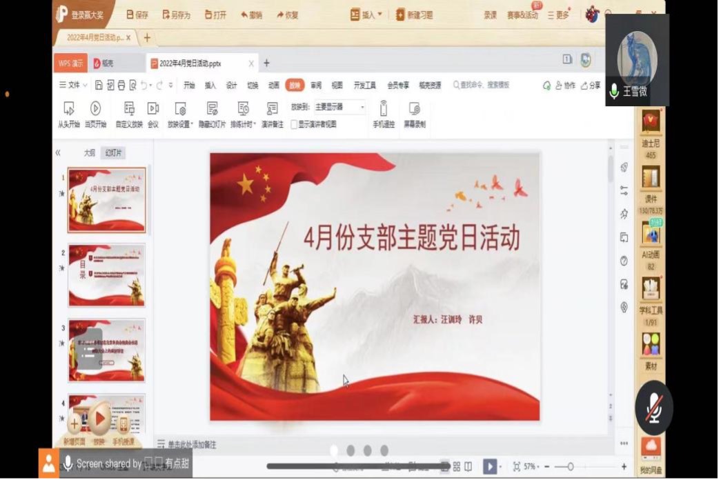 2022年4月25日下午19:00政国院国际政治系研究生第二党支部通过腾讯会议进行了线上四月党支部会议,支部全体党员和预备党员参加了此次会议,此次会议由支部第一党小组成员汪训玲和许贝主持召开。