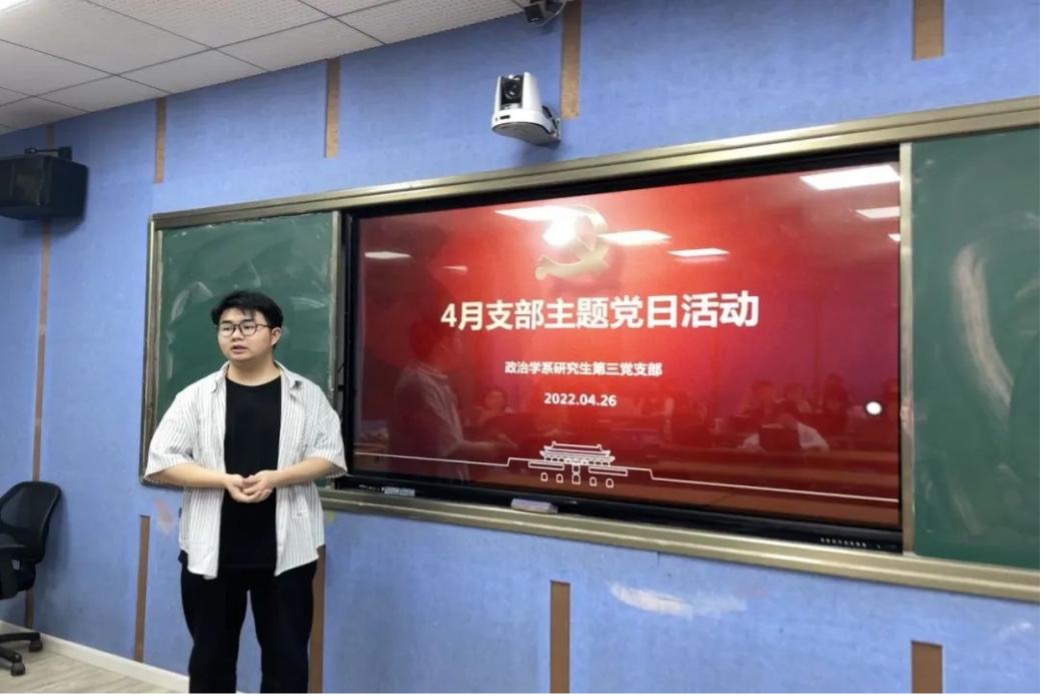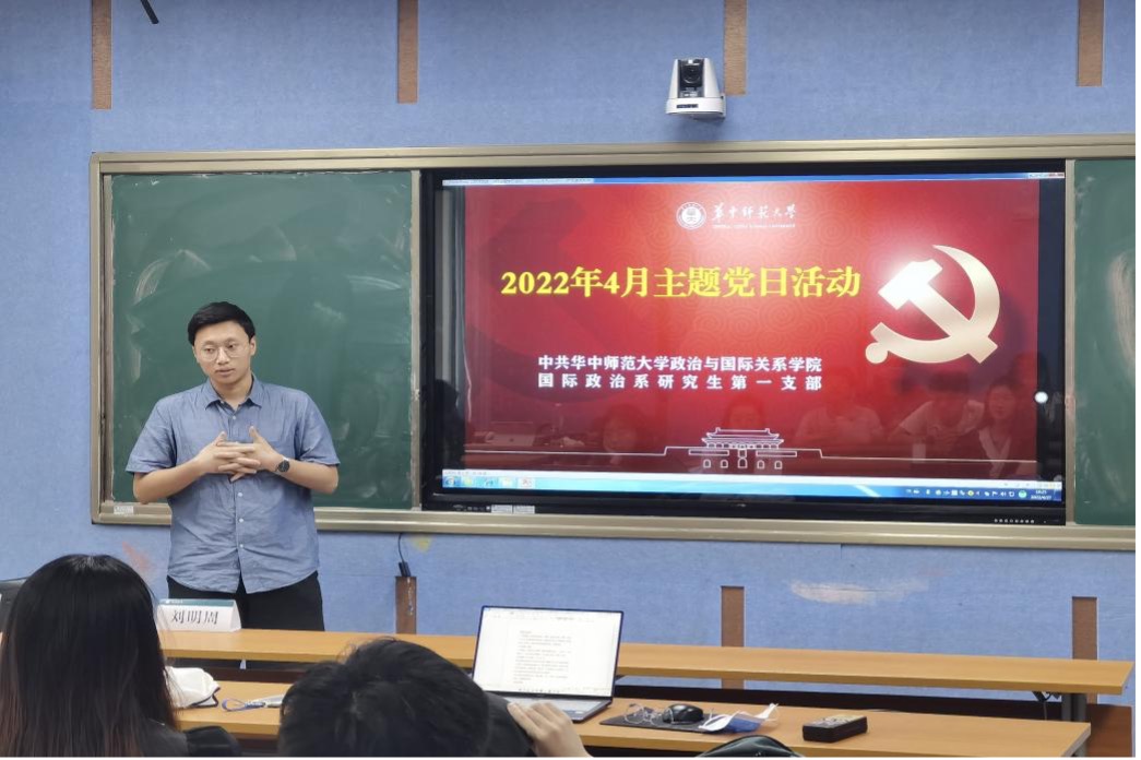 2022年4月27日,国际政治系研究生第一党支部(以下简称“第一党支部”)在政治与国际关系学院304教室开展4月主题党日活动。第一党支部第一学习小组成员负责此次主题党日活动,组长孙晨同志主持,参与人员为支部全体党员、发展对象以及入党积极分子。