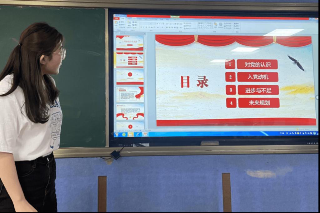 1.支部本次共推选出九名入党积极分子,赵丹阳同志作为代表,从对党的认识、入党动机、进步与不足和对未来的规划等方面向支部作现场汇报。她表示中国共产党是一个思想先进、艰苦奋斗、以人民为中心的政党,今后会继续坚定马克思主义信仰、努力学习理论知识、积极参与社会实践,为更好地融入党员集体而努力。