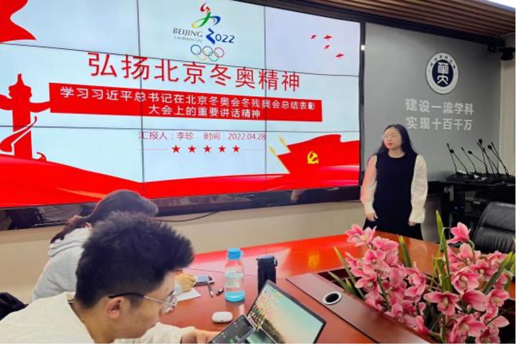 第二党小组的雷成鹏为大家介绍了冬奥会残奥会举办情况,带领大家学习习近平总书记在北京冬奥会残奥会总结表彰大会上的重要讲话,深刻解读“胸怀大局、自信开放、迎难而上、追求卓越、共创未来”的冬奥精神。