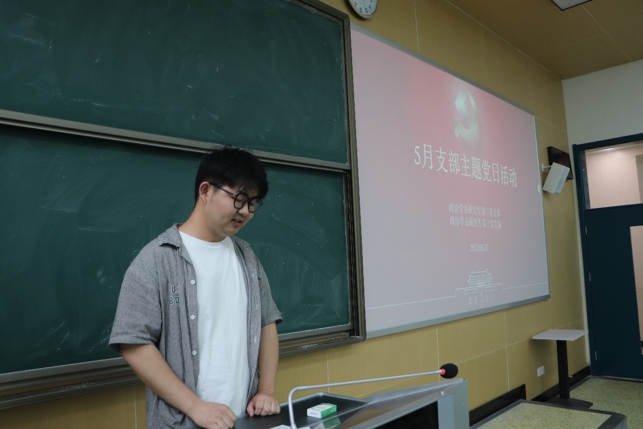(通讯员:齐心 邓俊豪)为了切实加强毕业生党员和非毕业生党员之间的联系,进一步加深高低年级党支部之间的纵向交流,推动毕业生党员专题教育走实走深,2022年5月27日下午,政治学系研究生第三党支部与政治学系研究生第二党支部在八号楼8108教室联合开展了5月支部主题党日活动暨2019级&2020级政治学系党员交流会(毕业生欢送会),以期能够及时学习政治学系研究生第二党支部丰富的支部建设经验,并且创造机会让师兄师姐在科研、升学、就业等方面的宝贵经验能够及时地传承给师弟师妹们。本次活动分为5月支部主题党日活动和2019级&2020级政治学系党员交流会(毕业生欢送会)两项议程,由政治学系研究生第三党支部书记邓俊豪同志主持,政治学系研究生第三党支部和第二党支部全体党员参会。
