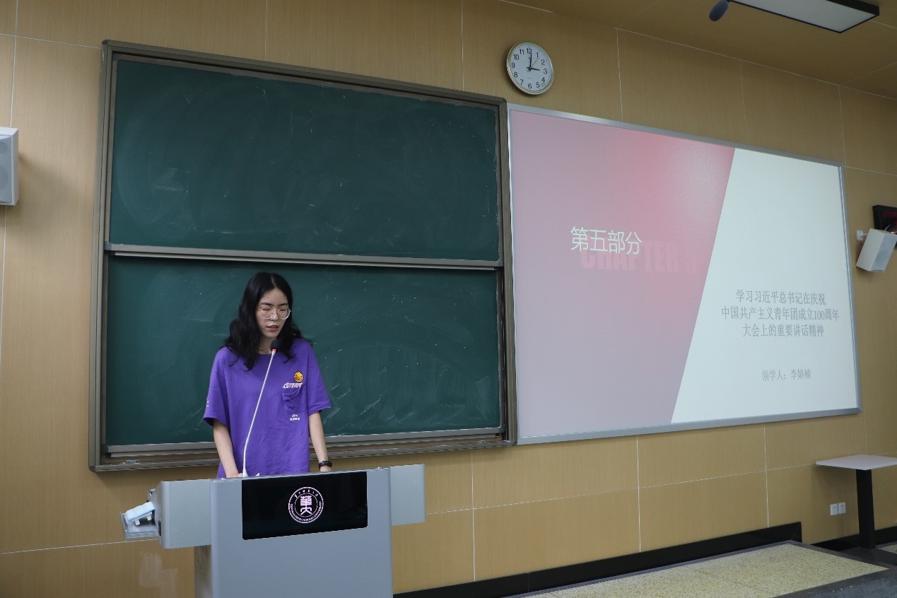 活动进入第五项,由政治学系研究生第三党支部的李婧楠同志领学习近平总书记在庆祝中国共产主义青年团成立100周年大会上的重要讲话精神。李婧楠同志梳理了习近平总书记在本次大会上的重要讲话内容,她表示,习近平总书记在会上首先回顾了自共青团成立以来的百年青运史,总结了建团百年来的宝贵经验,同时向新时代的共青团建设提出希望,向各级党团组织提出工作要求。根据这一思路,李婧楠同志逐一介绍了每一部分的重要内容,其讲解充实且详细,使得与会同志对习近平总书记在庆祝中国共产主义青年团成立100周年大会上的重要讲话精神有了更加全面的领会。最后,李婧楠同志以毛泽东为陕北公学成立的题词为结尾,与参会同志共勉,她表示,无论在什么时代,中国都需要这样的先锋分子,因此我们应当严格要求自我,做脚踏实地、富于实际精神的人,做胸怀坦白的、忠诚的、积极的、正直的中国青年!