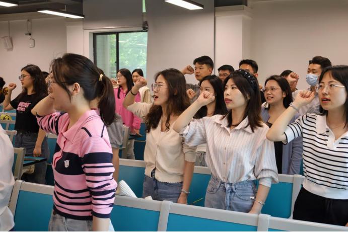 活动第一阶段,开展主题党日活动。首先,由20级支部书记邓俊豪同志、22级支部书记彭振雄同志带领全体党员重温入党誓词。通过庄严的仪式感,进一步激发了全体党员的爱国爱校情怀。