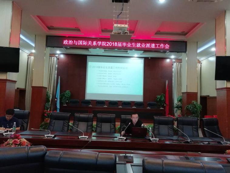 (通讯员 朱晨晨)2018年5月11日,为推动我院毕业生就业工作有序展开,政治与国际关系学院2018届毕业生就业派遣工作会在模拟联合国会议室举行。此次会议由本科生辅导员孙延松主持,党政办主任、研究生辅导员潘广炜主讲,我院毕业年级本科生、硕士研究生、博士研究生共计一百余人参加。