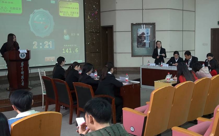 本场比赛的辩题是“现代社会,结婚需不需要门当户对”,我院辩论队是反方,其观点是“现代社会,结婚不需要门当户对”。随着主席介绍完辩论规则、现场的评委老师,比赛正式开始。
