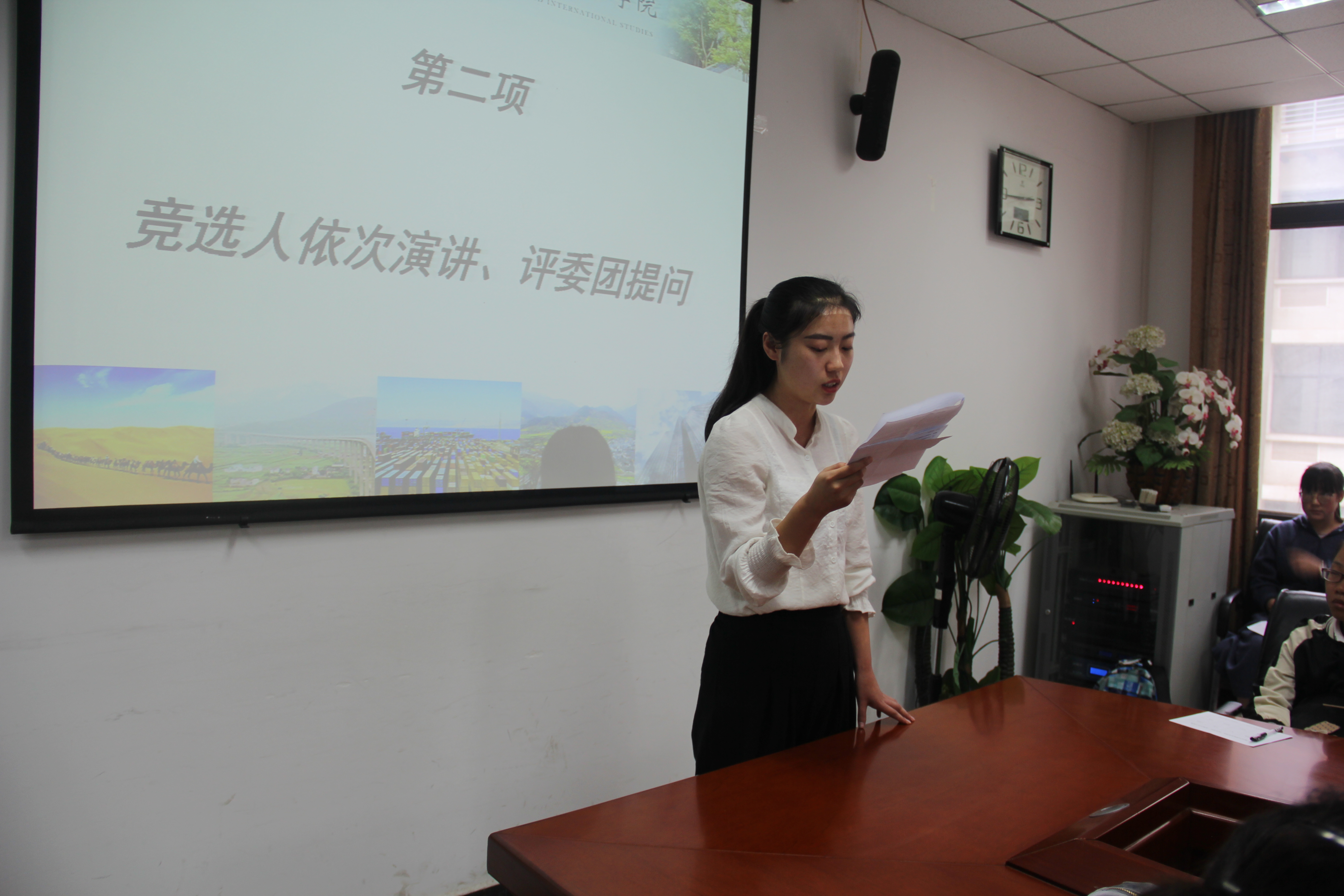 在竞选过程中,曹帅英同学以“中国足球”作为切入点,观点独到、立意新颖,评委团表示赞赏并提出改进台风以及改变称谓等建议。本科生李睿同学以“知行合一,赴一场与四进四信的约会”为题,她声情并茂、流利熟练的演讲赢得在座师生的阵阵掌声。李媛媛同学围绕“坚持终将美好”展开自己的论述,她将抒情、叙事、理论充分融合引发同学们深入思考,她的演讲稿被评委称为此次竞选活动中最好的演讲稿。王倩祯同学作为最后一名主讲人登台,她沉稳大气的台风、娓娓道来的叙述为此次竞选活动画上了圆满的句号。
