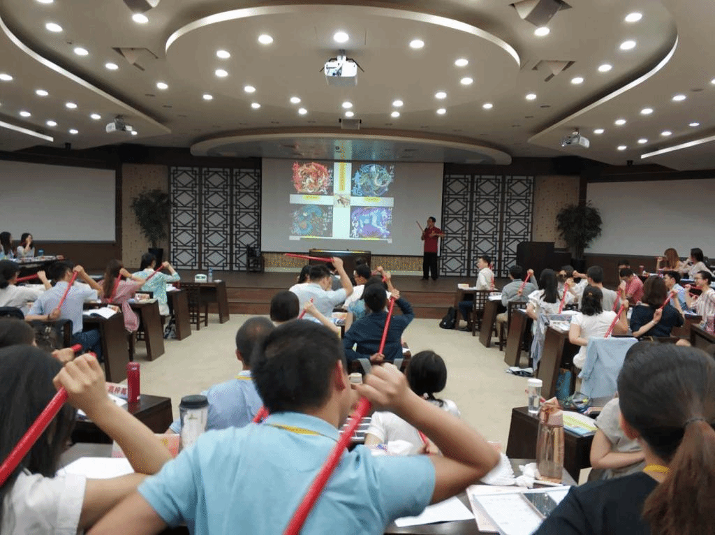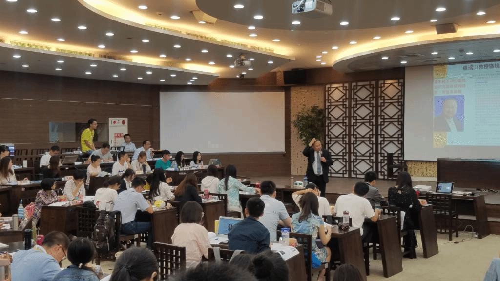 上午的第一节课程是由德明财经科技大学资管系副教授卢瑞山讲授的"区块链的概念与应用"。卢教授运用大量生动形象的例子,向同学们介绍了区块链的概念。他指出:"比特币对人类文明的意义是创造了人类文明史上全球一套通用的账本。"随后,在卢教授的指导下,同学们通过游戏的形式模拟了区块链技术,对区块链这一未来发展趋势有了更深刻的了解。接着,台湾国防大学通识教育中心副教授郭世清为同学带来了"身心健康与中医养生:现代人需要的舒压功法"课程。郭世清教授带领大家一起学习易经棍法,并指出:"改变自己要从参与锻炼,强健身体开始。"随后,同学们站起身跟随郭教授完成了一整套四式达摩易经棍法。