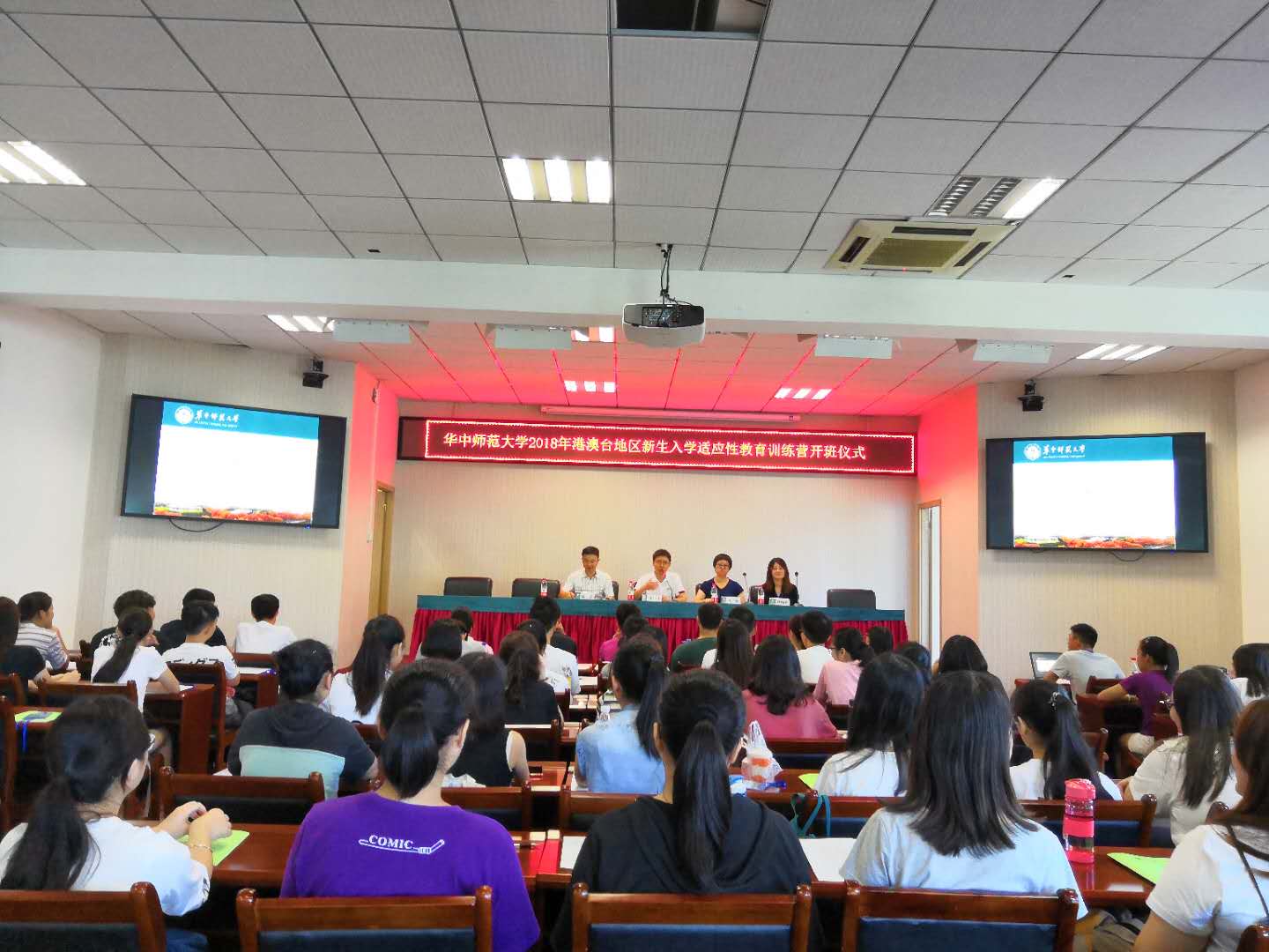 2018年9月4号,华中师范大学港澳台新生训练营开班仪式在大学生活动中心403顺利举行。64名港澳台新生全体参加,学生工作部学生事务管理办公室陈志老师、学生工作部副部长李刁老师、港澳台事务办公室项目主任董珊老师、港澳台新生训练营班主任骆婉婷老师出席了此次活动。陈志老师担任此次活动的主持人。