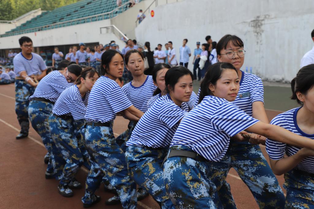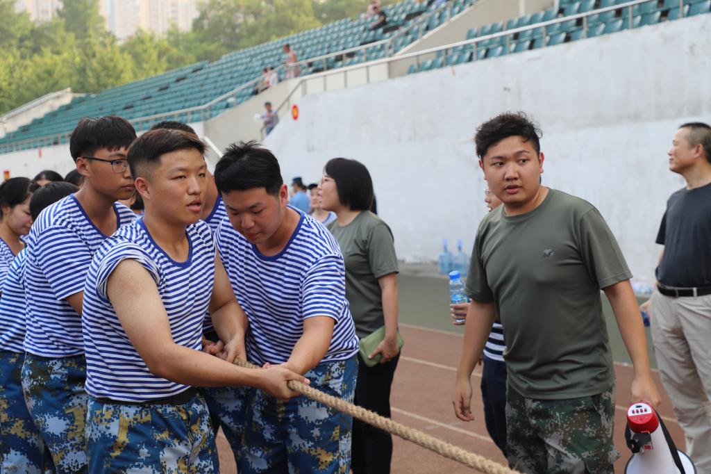 在辅导员赵云龙及方队教官的带领下,同学们怀着为院争光的激动心情进入了比赛场地。比赛队员听从教官的指导正确站位,个个摩拳擦掌,跃跃欲试。“哗——”一声哨响,比赛正式开始。大家双手发力,向后半蹲。前部的同学使劲向后拉,后部的同学扎紧底盘,稳如泰山。未上场的同学则为他们加油助威,呐喊声响彻整个体育场。电光火石之间,中间的布条左右摇晃,双方展开了一场拉锯战,最终我院新生体力不济,遗憾败北。