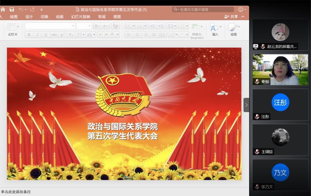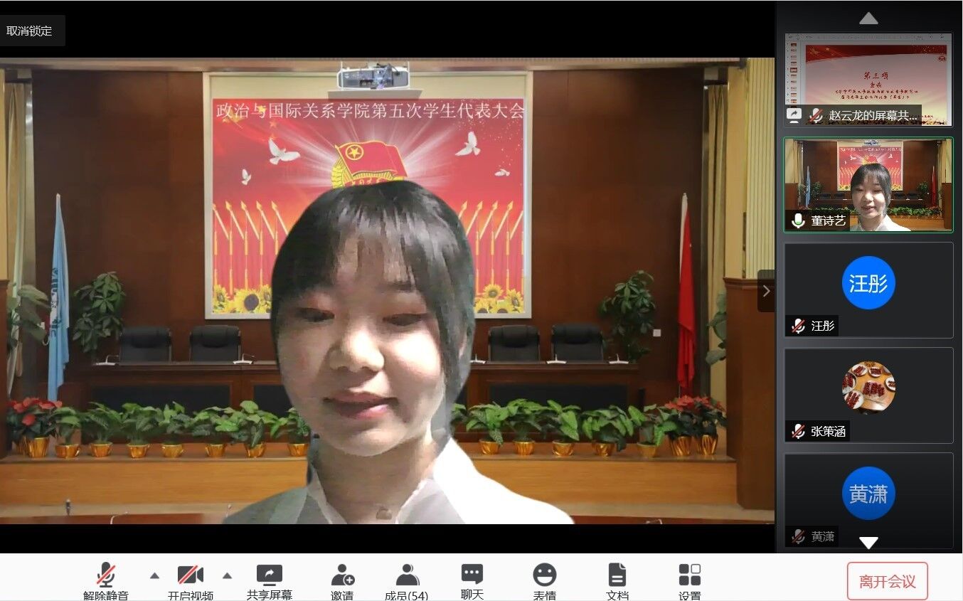 (通讯员 汪彤)为进一步强化学生会“自我教育、自我管理、自我监督”的意识,使学生会组织更好地扎根群众服务全院学生,政治与国际关系学院(以下简称“政国院”)在学校团委和学院党委的指导下,于5月30日下午通过腾讯会议平台召开了第五次学生代表大会。学院党委副书记秦恒、校团委副书记崔宏博应邀出席。院团委书记赵云龙老师主持本次学代会,研究生学生代表王铭歆担任总监票人,第四届学生会全体成员和部分学生代表参会。