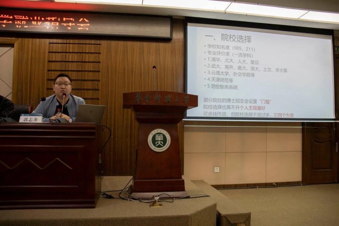 随后考博升学代表郭志奔学长、和直博升学代表黄祥祥学长、就业代表何虞清学姐及王瑞菲学姐为2021届研究生毕业生分享考博及就业经验。