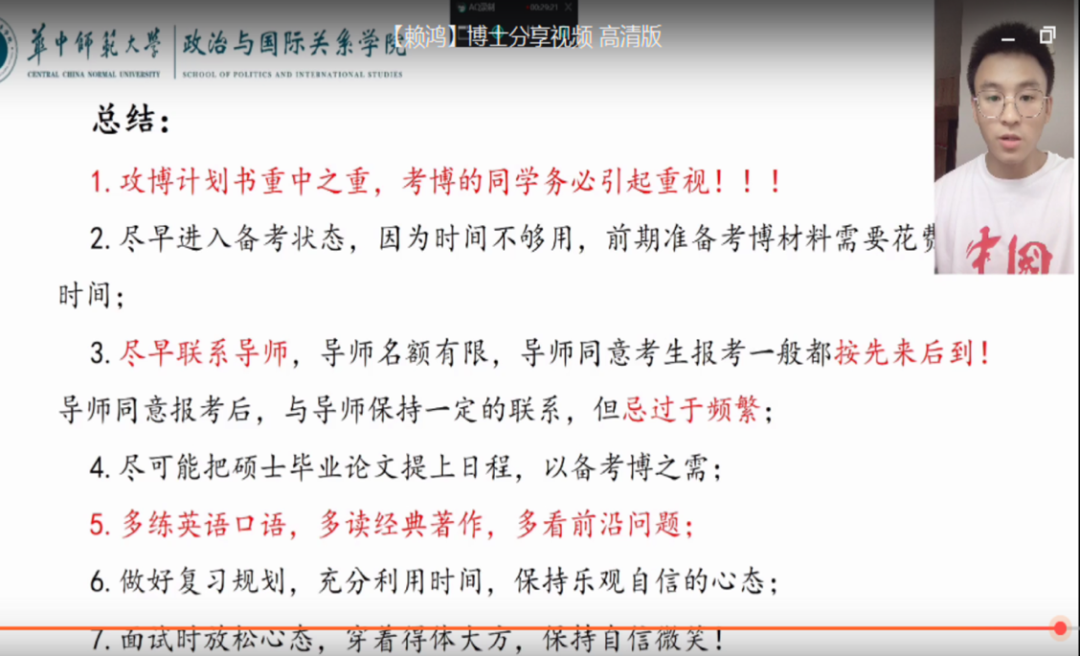 考博升学代表赖鸿学长(考取中国人民大学博士研究生),因不能现场参加分享会,特意精心录制了视频讲述考博经验。赖鸿学长从如何备考、选专业院校以及面试准备等方面进行分享。他谈到考博要注意前期的准备工作,比如英语口语的练习、专业课程的复习等。
