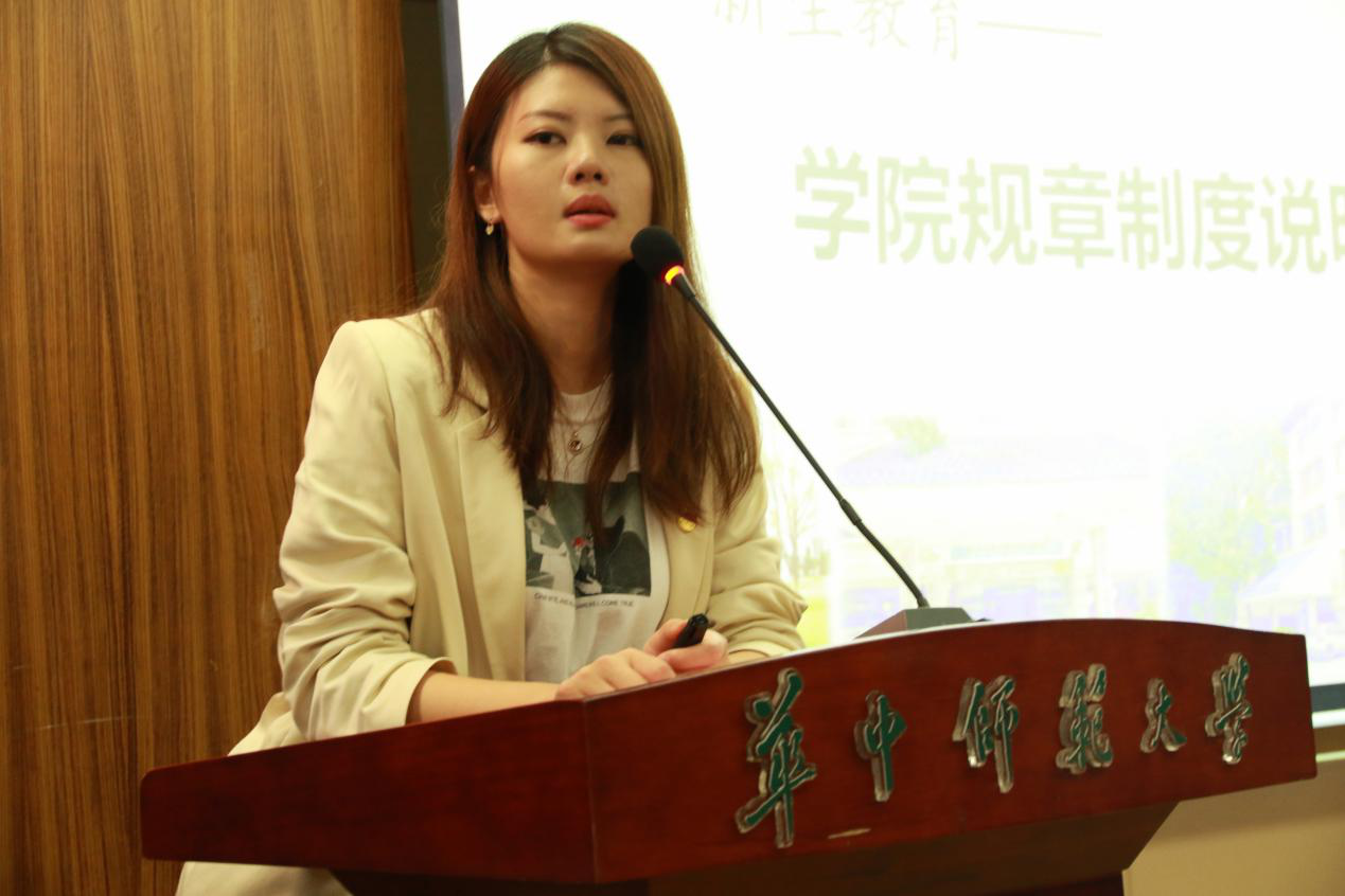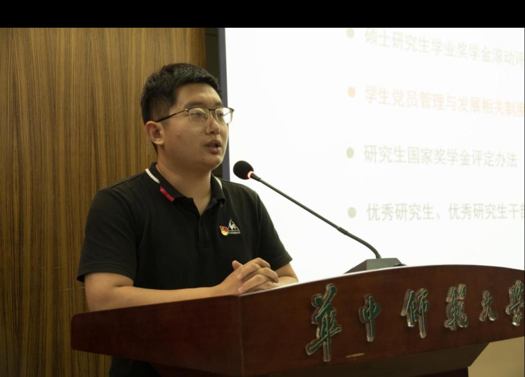 第八项议程,由骆婉婷老师和孙延松老师分别作新生适应性教育讲话。骆老师主要围绕研究生学业奖学金滚动评定办法、学院规章制度以及研究生学生工作等方面展开解释说明,并对研究生新生未来的研究生生活表示期许。孙老师主要围绕研究生党建发展方面展开介绍说明,强调入党是一件严肃且神圣的事情,要求各位同学要认真对待,严以律己,以身作则。