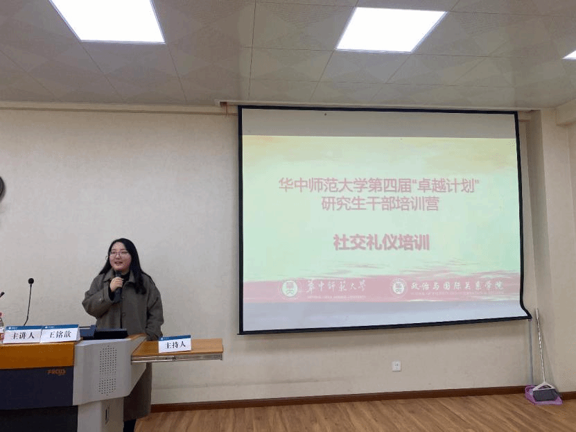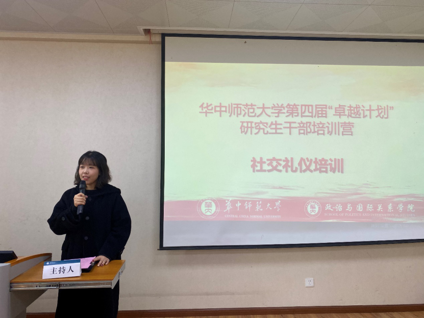 (通讯员:薛晓燕)2020年11月30日下午,华中师范大学第四届“卓越计划”研究生干部培训营:社交礼仪培训活动在教育学院502教室成功举办。此次活动由华中师范大学研究生会主办,政治与国际关系学院研究生会承办。华中师范大学数学与统计学学院党务干事兼本科生辅导员王铭歆老师担任主讲人,政治与国际关系学院团委副书记胡晓琳主持本场活动。校院两级研究生会的主要成员参与了本次培训,并认真聆听了讲座。