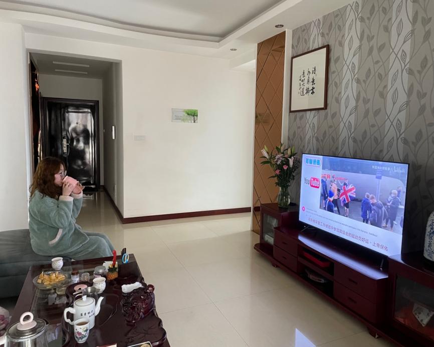 图为赵丹丹观看中国选手谷爱凌自由式滑雪女子大跳台决赛