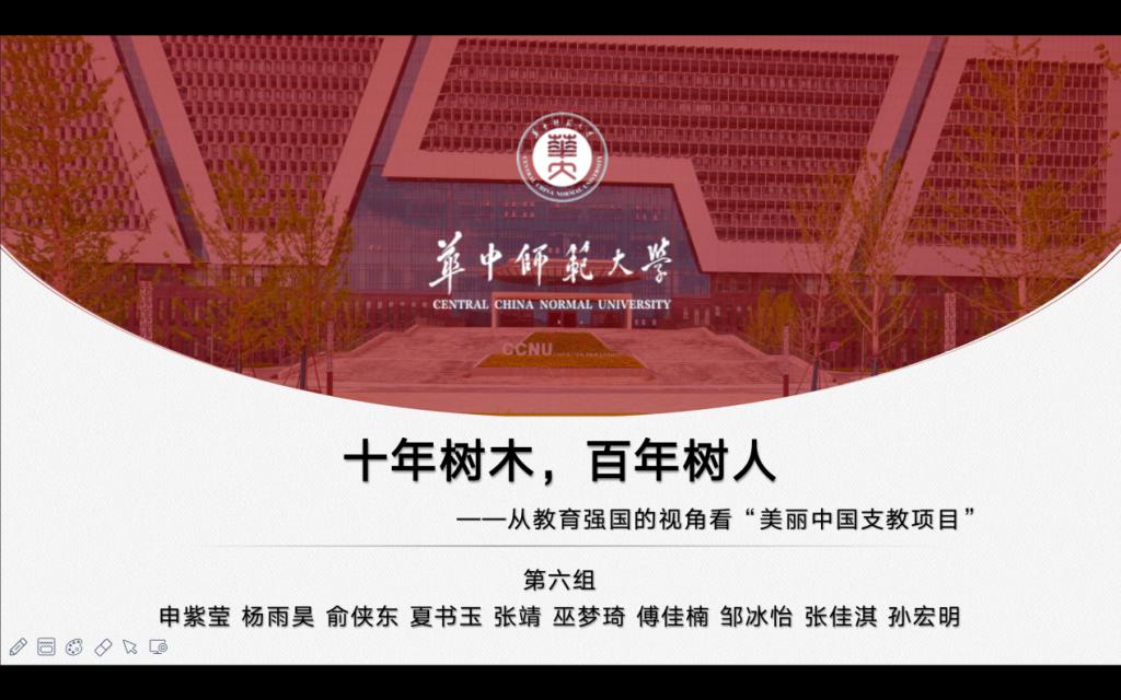 第六小组以华师“立德树人”的校魂为主题,带领大家从教育强国的视角看“美丽中国支教项目”。在宏观层面上学习习近平总书记关于教育的重要讲话,与我校师范教育为本相契合;在中观层面上,向大家详细介绍了“让所有中国孩子,无论出身,都能获得同等的优质教育”的美丽中国支教项目,在这一项目中,从不乏华师人的身影;在微观层面,广大青年学子刻苦学习专业知识,全面提升个人能力,提高思想政治素质,才能为推进教育强国打下坚实的人才基础。