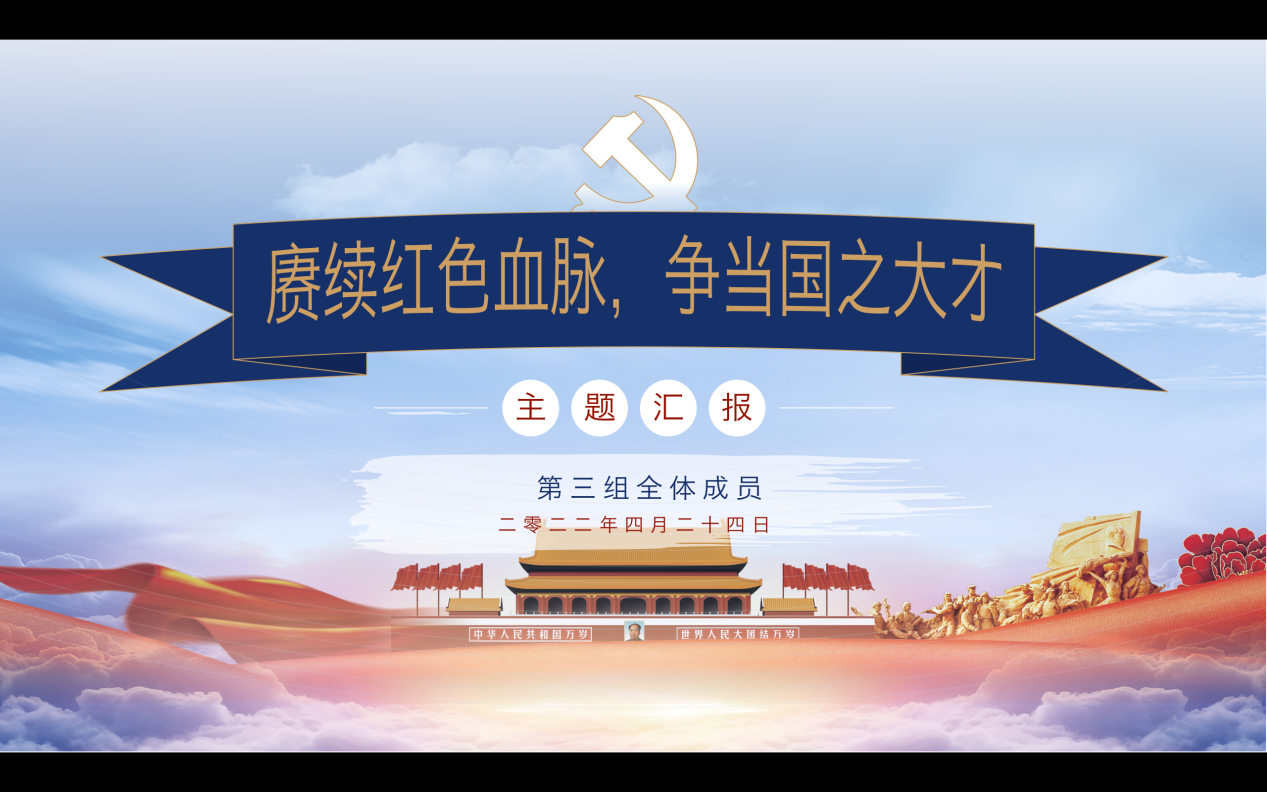 第三小组以“赓续红色血脉,争当国之大才”为题,在中国共产党厚重的百年历史中,在新民主主义革命的进程里,陈独秀、李大钊等一位位伟人足以让吾辈仰辰;新中国的成立,仿若东方破晓,我们开启了建设中国的伟大历程,焦裕禄精神、两弹一星精神砥砺吾辈前行;改革开放40年春风化雨,40年春华秋实,引路人邓小平、先行者张勋甫如日月重光,带领吾辈奋进征程;新时代,旭日东升,新途璀璨,逐梦星空的太空摘星人王亚平,英姿飒爽,直上云霄,再叩苍穹!漫漫历史长河,先辈楷模足以令吾辈动容,将个人的价值取向和社会的需求有机结合,在促进社会进步中实现个人价值,是每个时代的永恒主题,也是吾辈一生都要追求和实践的永恒课题。