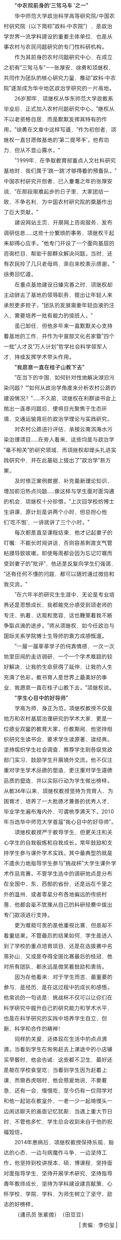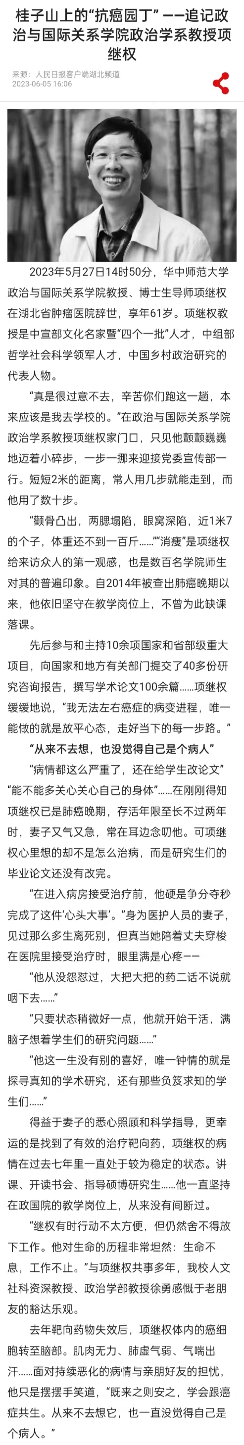人民日报讯(通讯员田豆豆)2023年5月27日14时50分,华中师范大学政治与国际关系学院教授、博士生导师项继权在湖北省肿瘤医院辞世,享年61岁。项继权教授是中宣部文化名家暨“四个一批”人才,中组部哲学社会科学领军人才,中国乡村政治研究的代表人物。