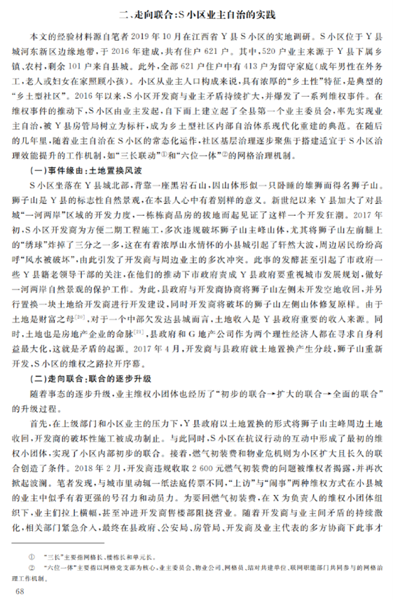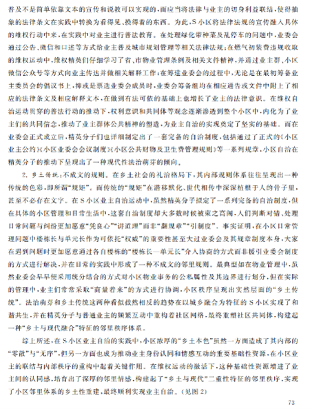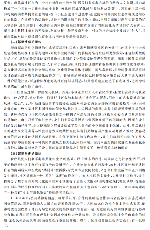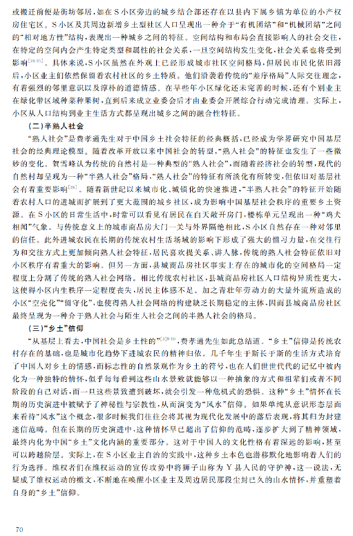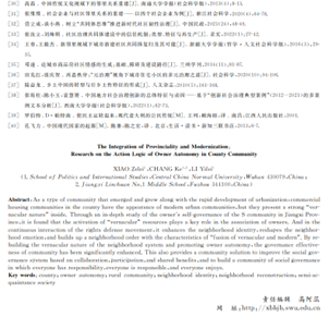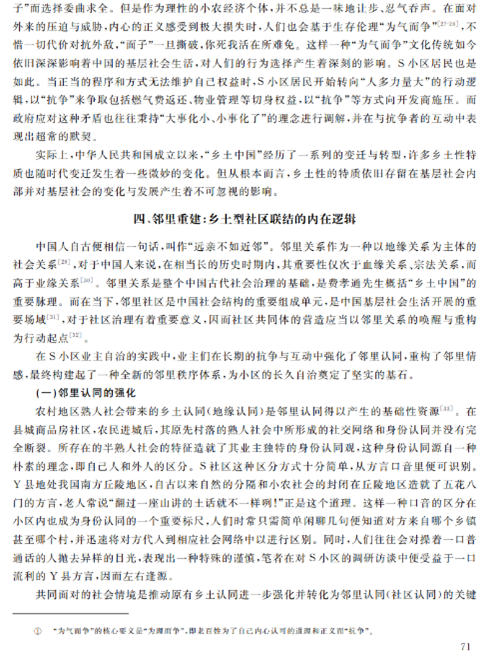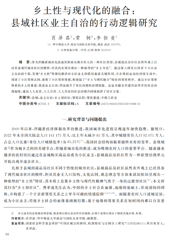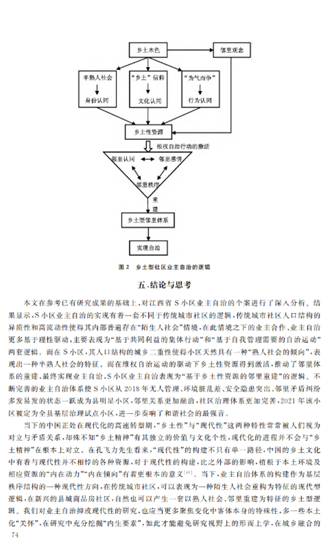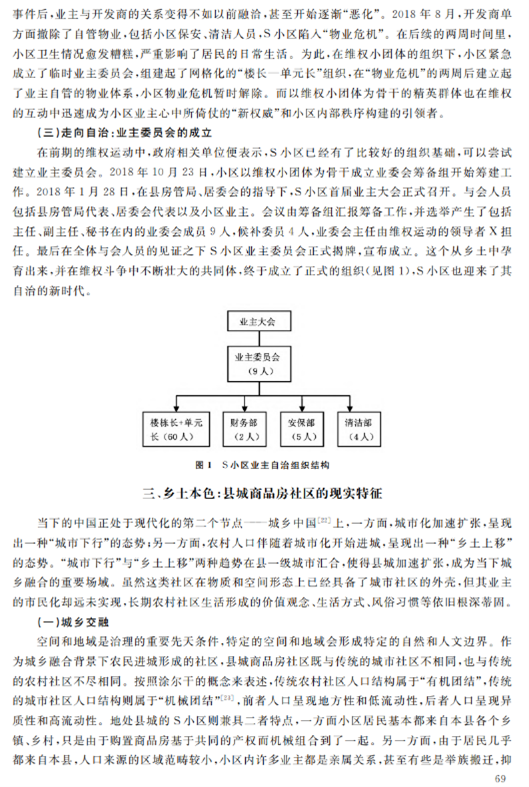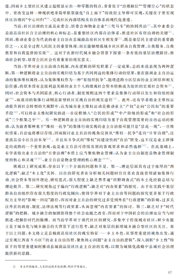 本文聚焦于县域社区的基层自治现象,对江西省S社区个案进行案例分析,创造性地从县域社区的“乡土性”与“现代化”融合的视角切入,发掘县城商品房的“乡土本色”,提出“乡土型社区”的概念,从乡土性角度解释县域社区的邻里重建。作者的洞见之处在于,在县域社区的自治行为中,独到地抓住了“乡土性”与“现代化”的特殊关系,将研究点聚焦于二者的融合,并以此解释现实案例中的业主自治行为,清晰、全面地展示了乡土型社区业主自治的逻辑:自社区“乡土本色”始,将乡土本色转化为身份、文化和行为的认同,进而将认同转化为资源,依托社区资源,重建乡土型邻里体系,实现从乡村到城市的转变,提高了治理效能。