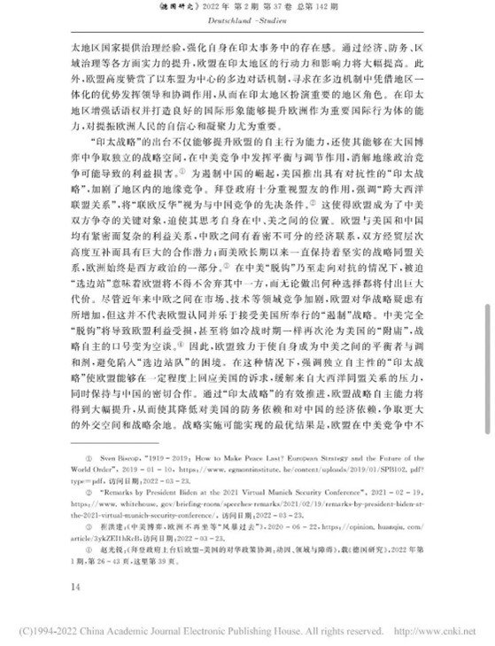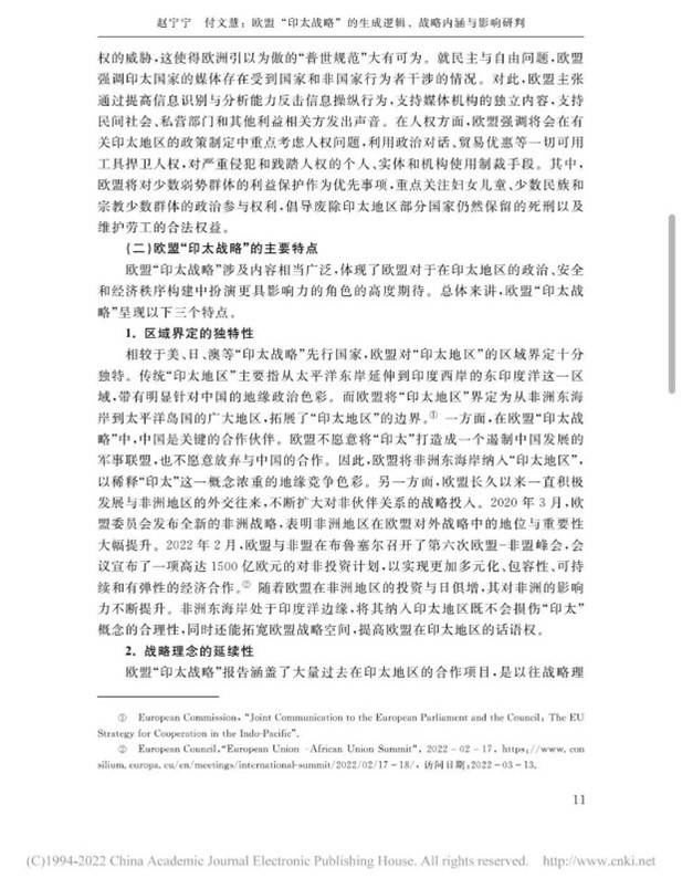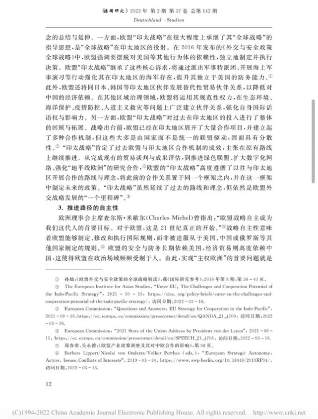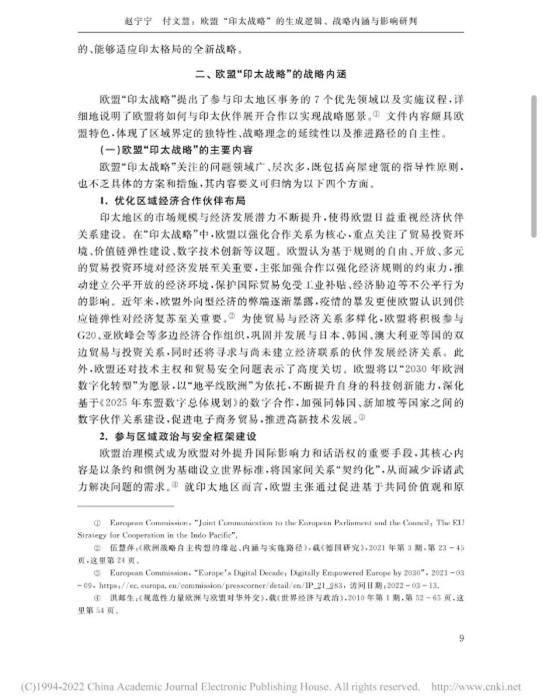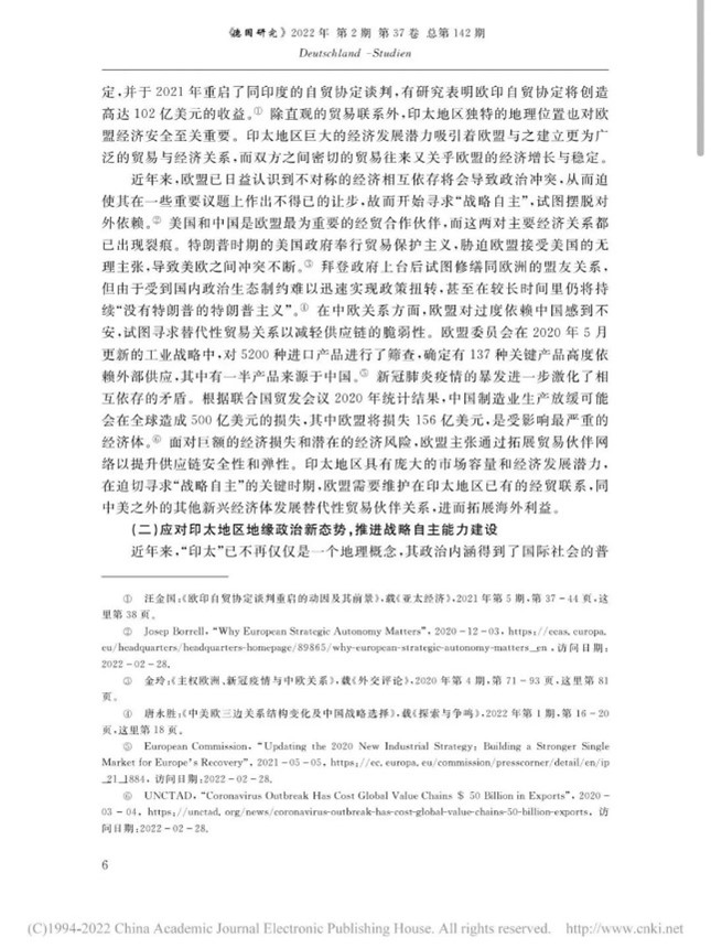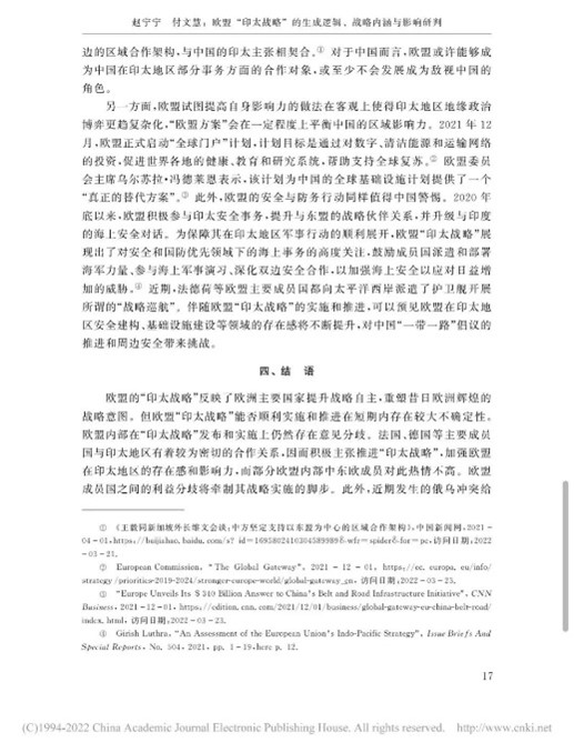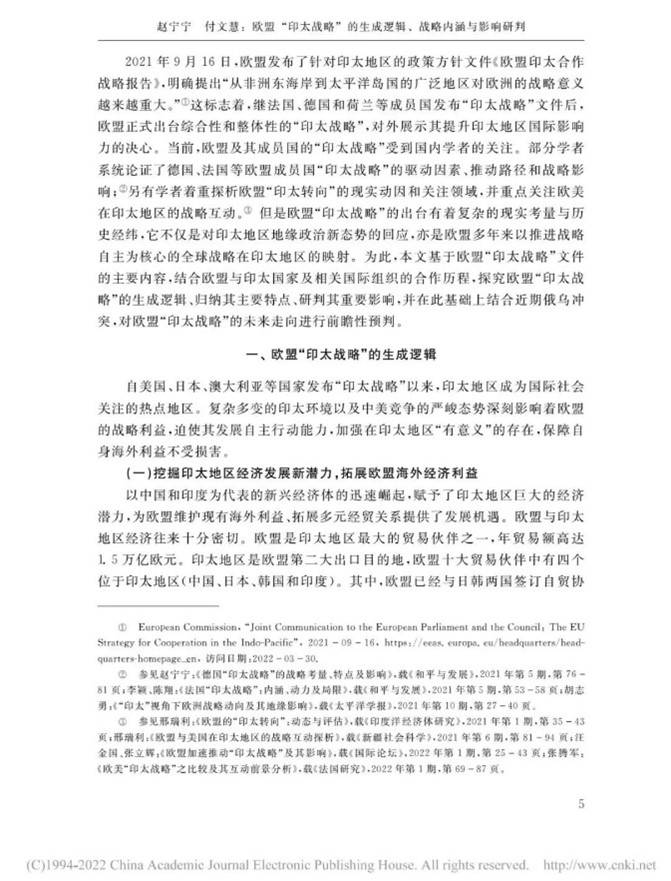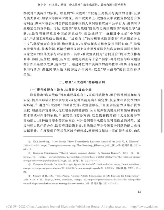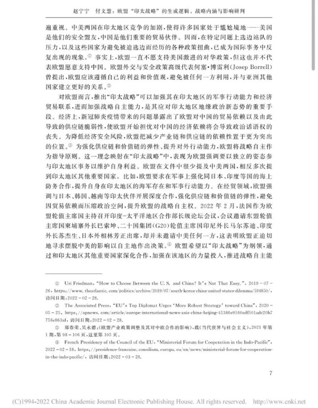 “亚太战略”向“印太战略”的改变,体现了欧盟从非洲东海岸到太平洋岛国谋求的战略意图的变化。这样的变化基于当下国际形势,也对国际形势产生影响。一方面,中美对抗程度的加深,使得欧盟在维护自身安全利益和经济利益方面的矛盾日益凸显。随着俄乌战争的爆发,为维护自身安全利益,欧盟不得不选择与美国靠拢,“欧洲人的欧洲”进程受到阻碍;在经济利益上,欧盟的经济高度依赖中国,而中国受疫情影响经济增速放缓,所以欧盟希望开辟新的方式来谋求经济利益。此时,本身与欧盟经济有联系的、以印度为代表的“印太”地区就成了欧洲战略的重点。如果欧盟的“印太战略”得以实施,对其自身影响力和自主性的加强以及对中美紧张局势的缓解都有积极作用。本文从欧盟的角度出发,详细论述了“印太战略”中欧盟的战略意图及其影响,使我收获颇丰。