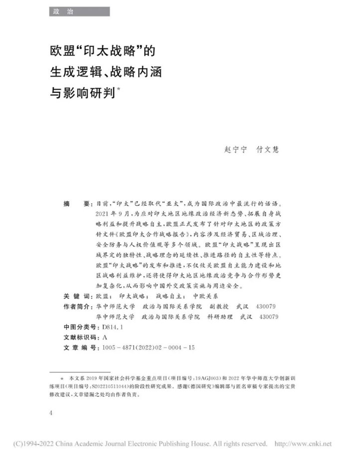 本文从2021年欧盟发布的《欧盟印太合作战略报告》入手,深入剖析欧盟印太战略变化的发布和推进,选题具有较强的新颖性和实用性。文章从欧盟“印太战略”生成逻辑、战略内涵和影响研判展开,总结得出欧盟的“印太战略”体现了其提升战略自主、重塑欧洲辉煌的战略意图,但是欧盟内部在“印太战略”发布和实施上存在意见分歧的重要观点。同时指出,中国需要承认印太地区的存在与重要性,并尽早拿出中国的“印太方案”。全文结构科学合理,逻辑性强,思路清晰,对问题的分析比较透彻,对于分析欧盟印太战略具有重要意义。