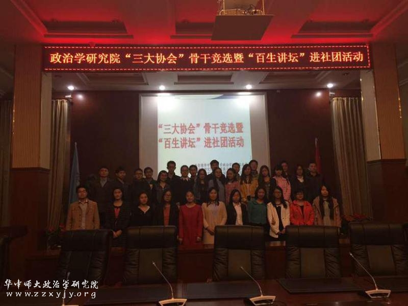 为有效加强我院协会组织建设,增强协会骨干力量,提高协会理论水平,2015年10月30日晚六时三十分,我院三农发展与研究协会、桂子山国际问题研究会及中国特色社会主义研究会在老图书馆四楼模拟联合国共同举行“政治学研究院‘三大协会’骨干竞选暨‘百生讲坛’进社团活动”。参加此次活动的有我院团委副书记吉雪燕、研究生会副主席李广志以及参选的2015级研究生、本科生同学,会议由三农发展与研究协会副会长邓正阳主持。