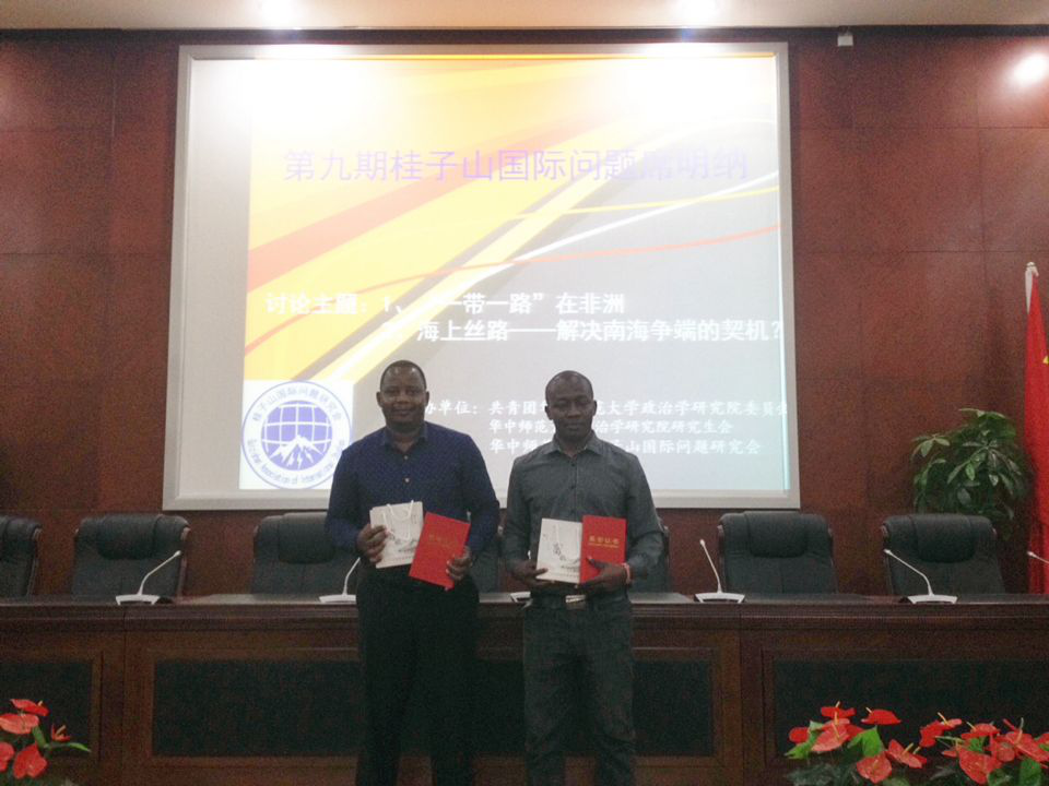 (通讯员:陈明月)527日,桂子山国际问题研究会在老图书馆四楼模拟联合国实验室举办桂子山国际问题席明纳第期活动,活动主要围绕路上丝绸之路与非洲及海上丝绸之路与南海问题展开了研讨。国际事务研究张弦博士、来自马拉维Ephraim Abel Kayembe博士和来自肯尼亚的硕士研究生Raphael Ziro应邀参加此次活动。