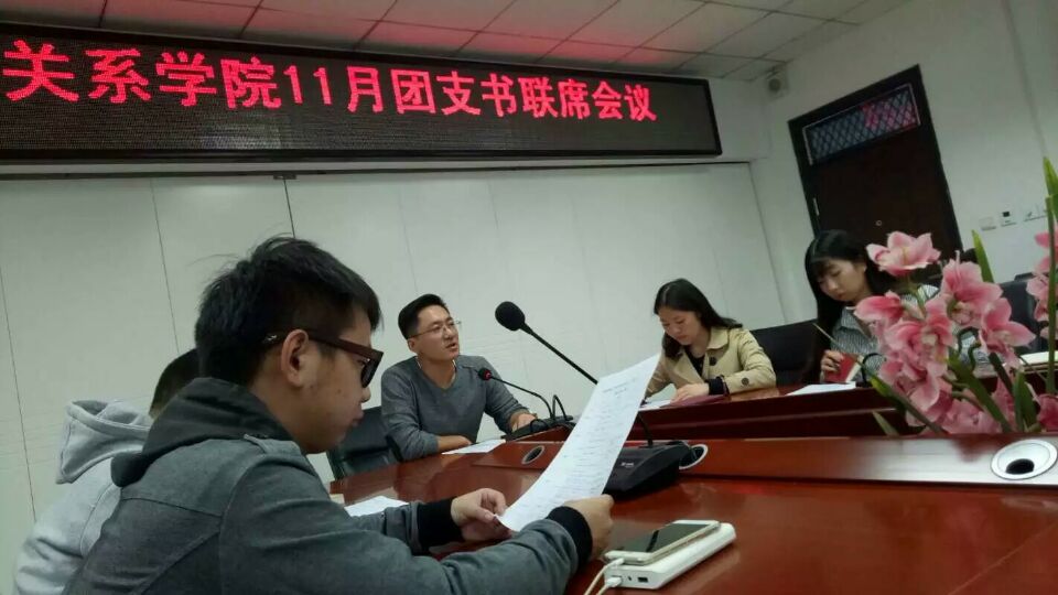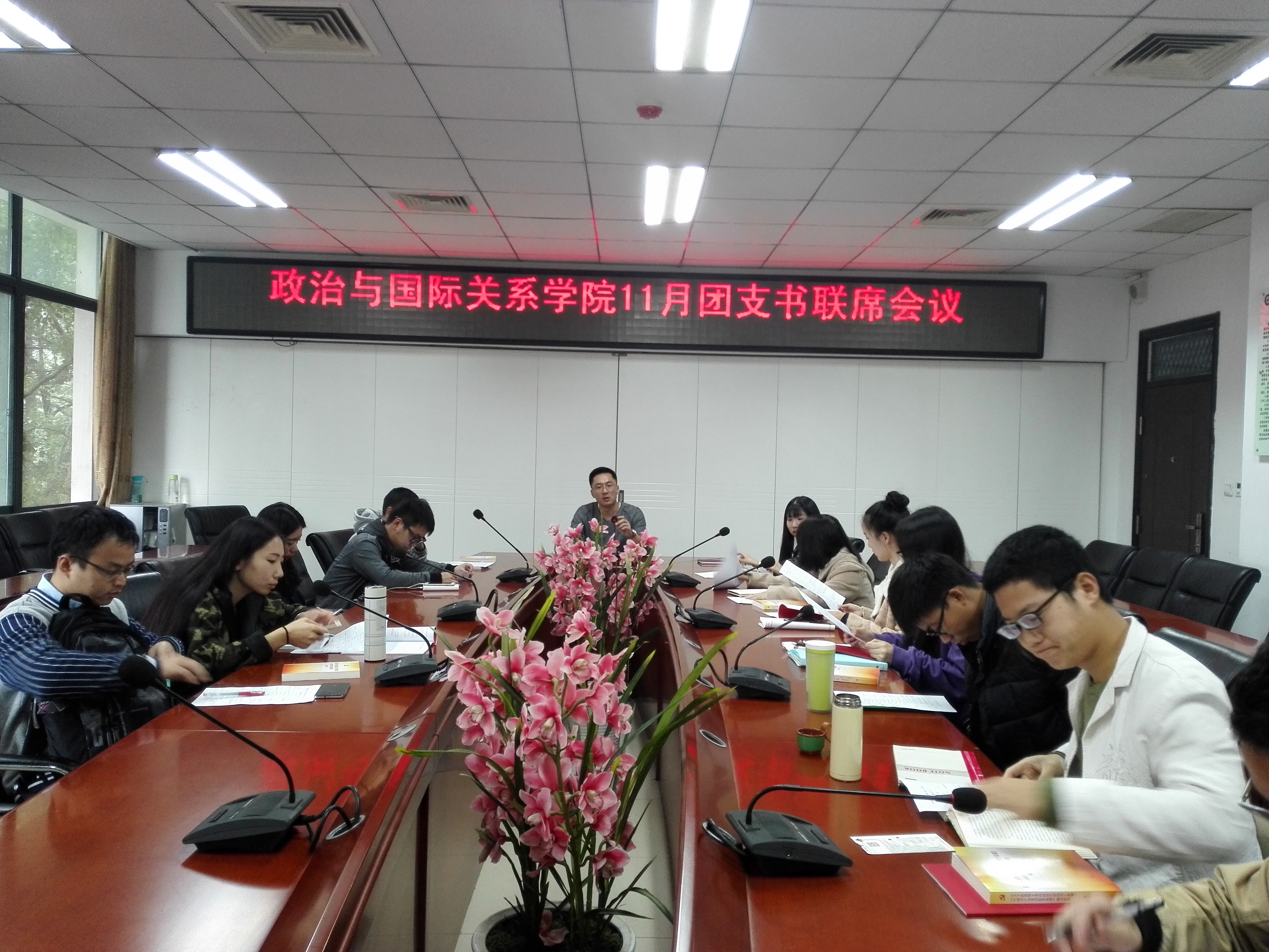 (通讯员 陈迷)11月15日,政治与国际关系学院十一月团支书联席会议在我院309会议室顺利召开。本次会议由院团委书记冯连军老师主持召开,团委副书记夏明慧同学,组织部部长陈迷、刘涵同学,各支部书记及组宣委员出席了本次会议。会议内容主要包括布置从十一月份开始,校团委组织部关于支部主题团日活动的新安排,以及督促支部书记按照校团委组织部要求,进一步规范本支部的团日活动材料上交等事宜。