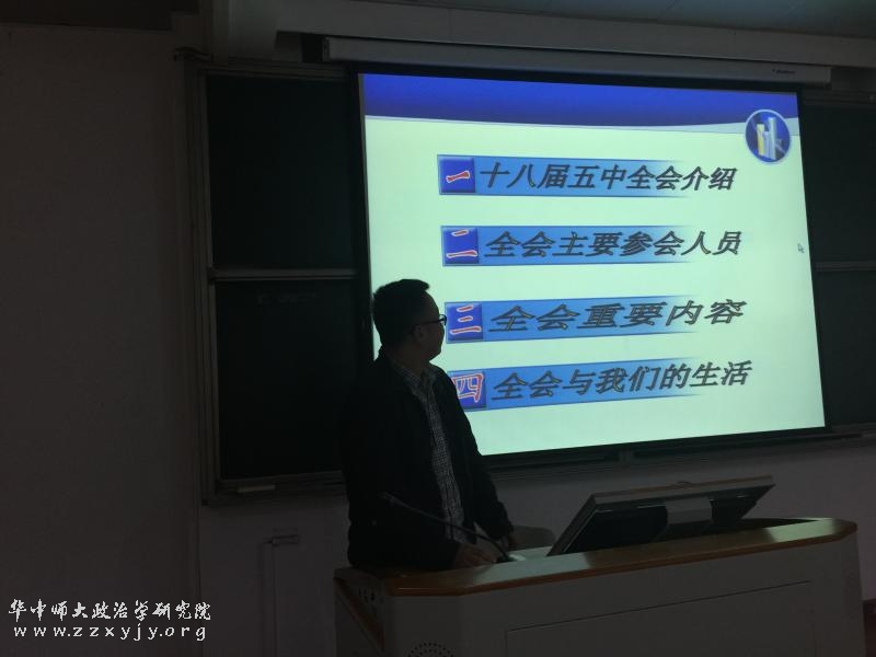 11月14日晚上18:00,我院2015级科社支部在3号教学楼118教室开展以“深入学习贯彻十八届五中全会精神”为主题的支部团日活动,认真落实团中央的相关通知要求,学习领会十八届五中全会的精神指示。