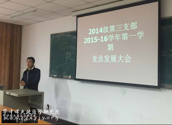 11月20日上午,政治学研究院2014级第三支部在学院313教室召开支部大会,会议主要内容是听取支部成员王孟航同学的思想汇报并对其是否发展成为预备党员进行举手投票表决。此次会议由14级科学社会主义专业同学参加,会议由支委组织委员李广志代为主持召开。