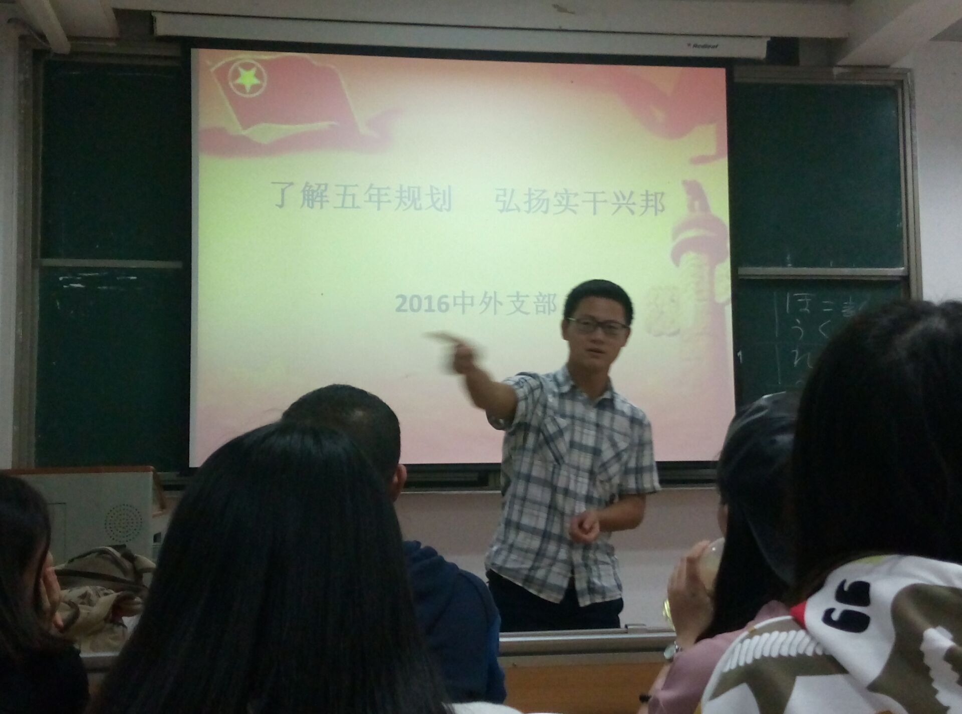 (通讯员 王旭鹏)2016年10月19日晚,16级中外支部在三号楼101教室成功举行了以“了解五年规划、弘扬实干兴邦”为主题的团日活动。中外支部18人全部出席此次活动,活动由支部书记吕瑞主持。