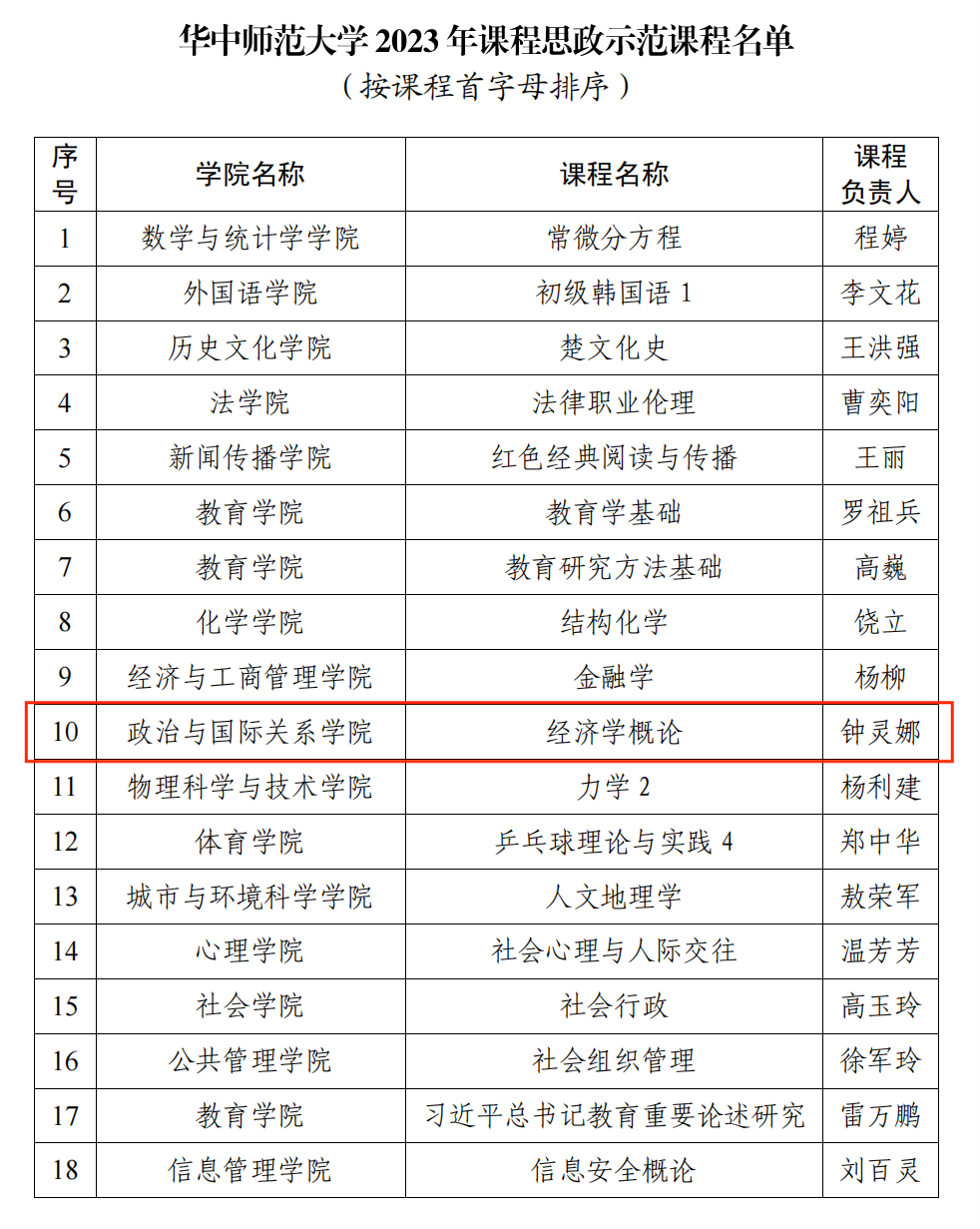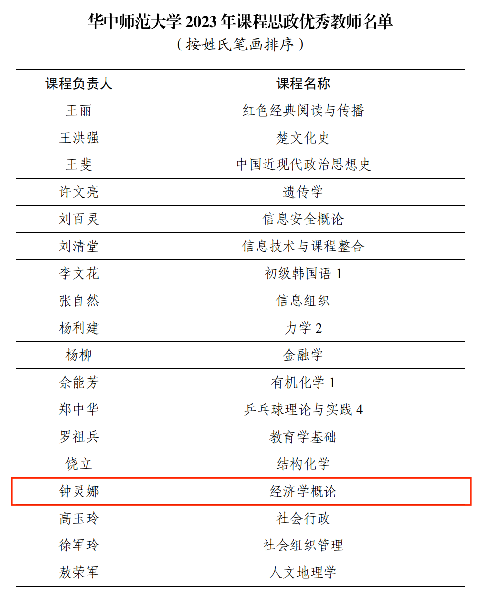 1月14日,华中师范大学发布关于授予2023年课程思政示范课程和优秀教师称号的决定,我院钟灵娜老师荣获2023年思政优秀教师称号,其课程《经济学概论》被评选为2023年思政优秀课程。