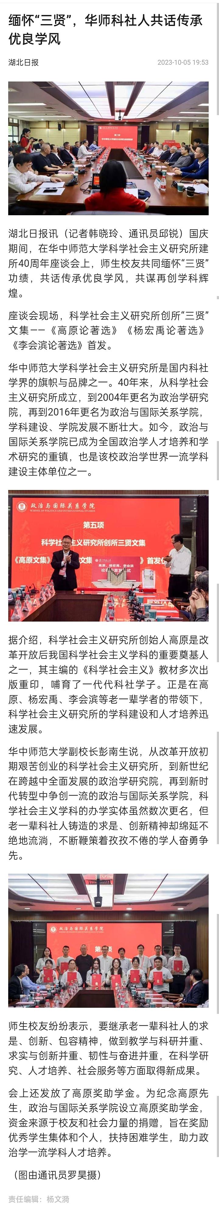 凤凰新闻社:缅怀“三贤”功绩 传承优良学风 再创学科辉煌——华中师范大学科学社会主义研究所建所四十周年座谈会举行